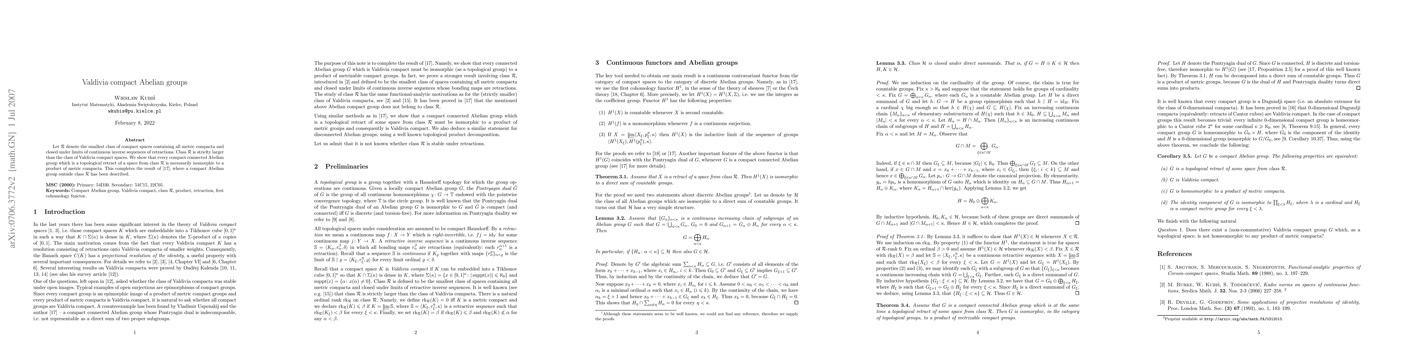 Let R denote the smallest class of compact spaces containing all metric compacta and closed under limits of continuous inverse sequences of retractions. Class R is striclty larger than the class of Valdivia compact spaces. We show that every compact connected Abelian group which is a topological retract of a space from class R is necessarily isomorphic to a product of metric groups. This completes the result of V. Uspenskij and the author, where a compact connected Abelian group outside class R has been described.