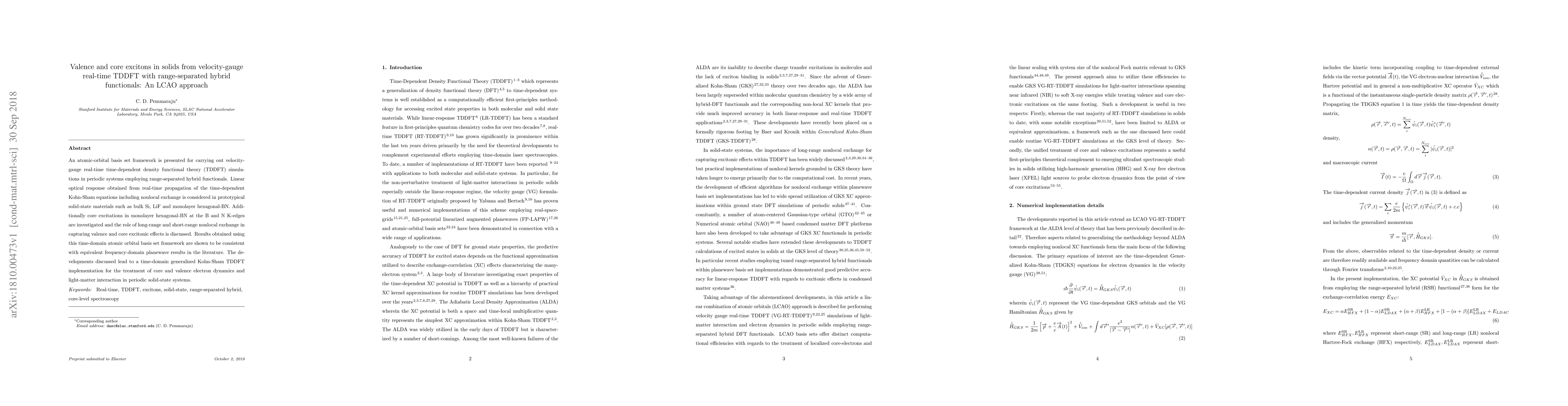 This paper introduces a velocity-gauge real-time TDDFT framework using range-separated hybrid functionals in an atomic-orbital basis set for periodic systems, demonstrating its application to bulk Si, LiF, and monolayer hexagonal-BN. It investigates the role of nonlocal exchange in capturing valence and core excitons, particularly at the B and N K-edges in hexagonal-BN, and shows consistency with planewave results.