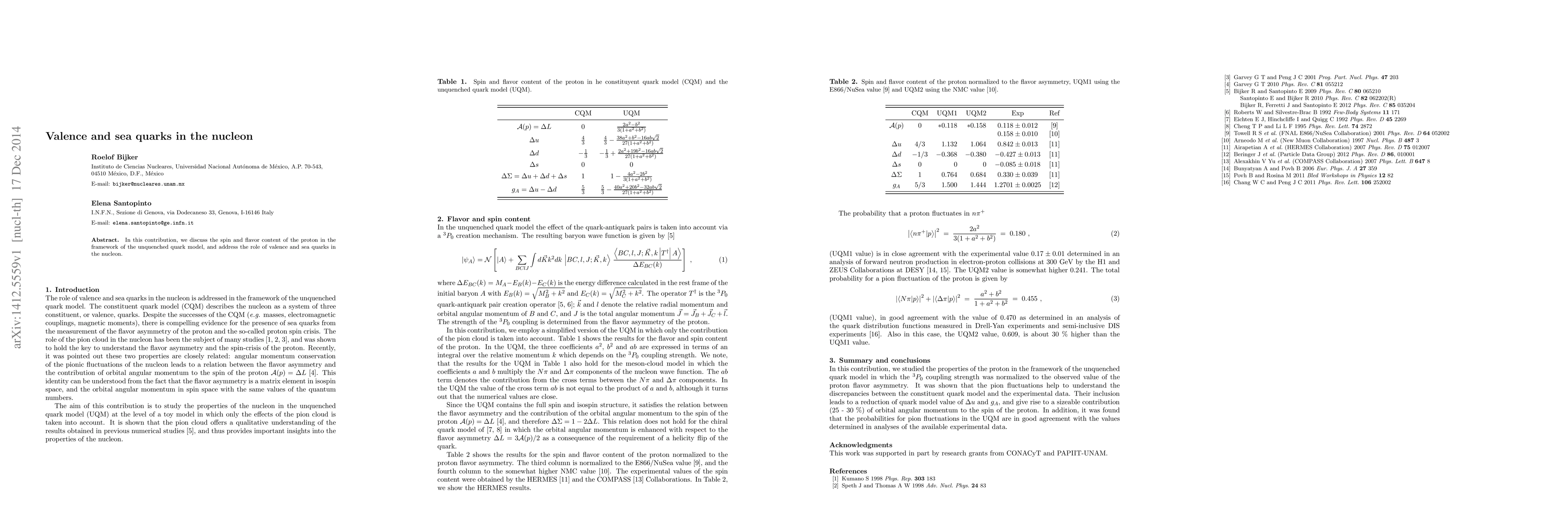 In this contribution, we discuss the spin and flavor content of the proton in the framework of the unquenched quark model, and address the role of valence and sea quarks in the nucleon.