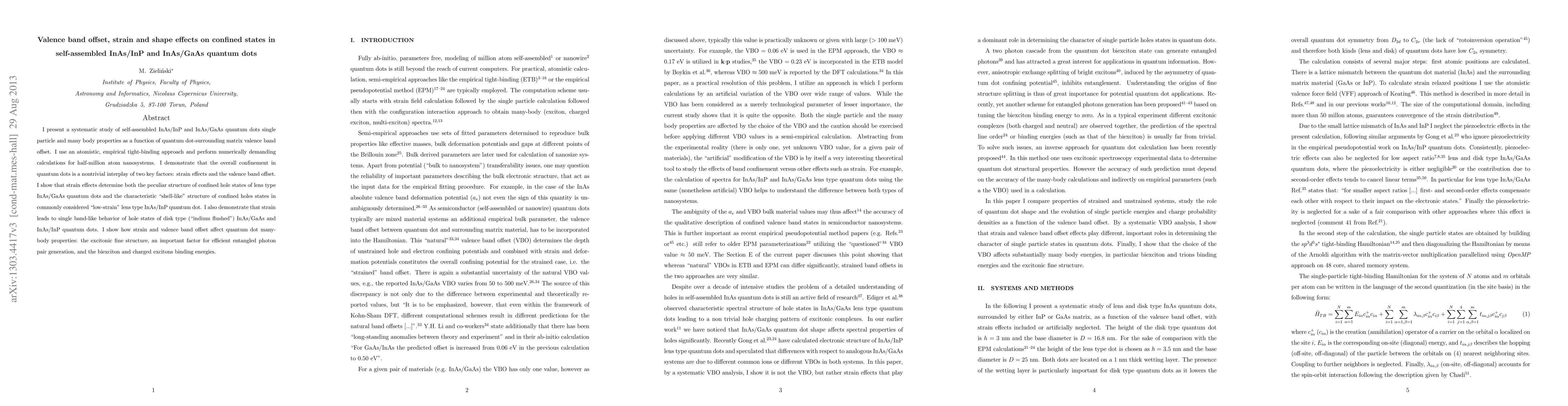 I present a systematic study of self-assembled InAs/InP and InAs/GaAs quantum dots single particle and many body properties as a function of quantum dot-surrounding matrix valence band offset. I use an atomistic, empirical tight-binding approach and perform numerically demanding calculations for half-million atom nanosystems. I demonstrate that the overall confinement in quantum dots is a nontrivial interplay of two key factors: strain effects and the valence band offset. I show that strain effects determine both the peculiar structure of confined hole states of lens type InAs/GaAs quantum dots and the characteristic ,,shell-like" structure of confined holes states in commonly considered "low-strain" lens type InAs/InP quantum dot. I also demonstrate that strain leads to single band-like behavior of hole states of disc type (,,indium flushed") InAs/GaAs and InAs/InP quantum dots. I show how strain and valence band offset affect quantum dot many-body properties: the excitonic fine structure, an important factor for efficient entangled photon pair generation, and the biexciton and charged excitons binding energies