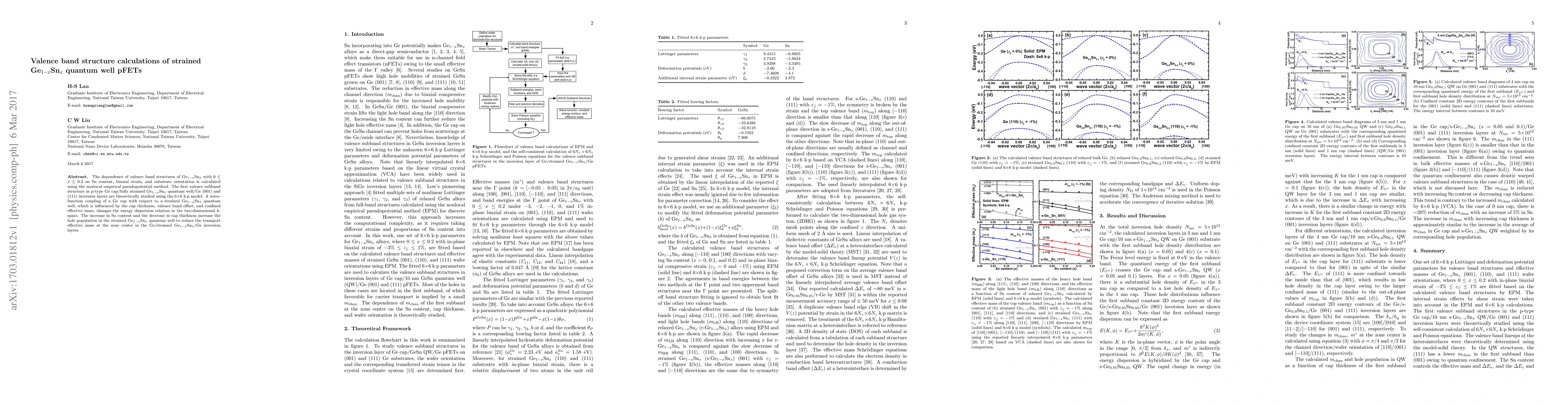 This paper investigates the valence band structure of Ge$_{1-x}$Sn$_x$ quantum well pFETs under various Sn contents, biaxial strain, and substrate orientations using the nonlocal empirical pseudopotential method. It finds that increasing Sn content and decreasing cap thickness enhances hole population and reduces transport effective mass in the Ge/strained Ge$_{1-x}$Sn$_x$/Ge inversion layers.