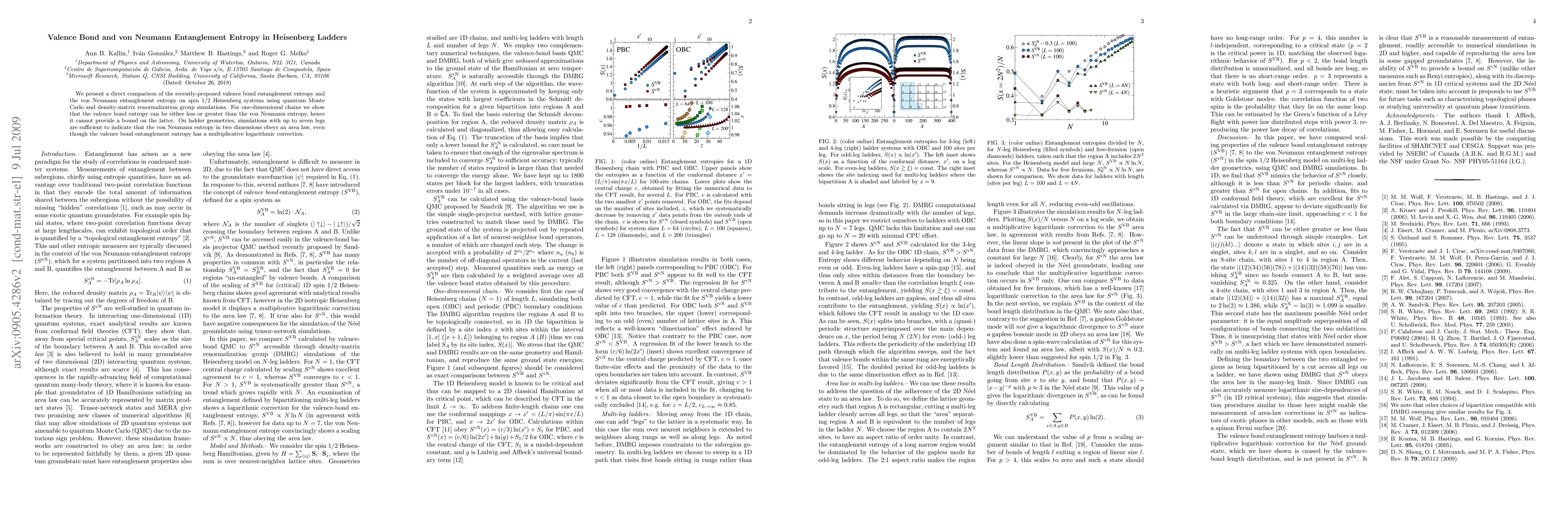 This study compares valence bond and von Neumann entanglement entropies in Heisenberg spin 1/2 systems, revealing that valence bond entropy does not bound von Neumann entropy in one-dimensional chains. In two-dimensional ladders, von Neumann entropy follows an area law, while valence bond entropy exhibits a logarithmic correction.