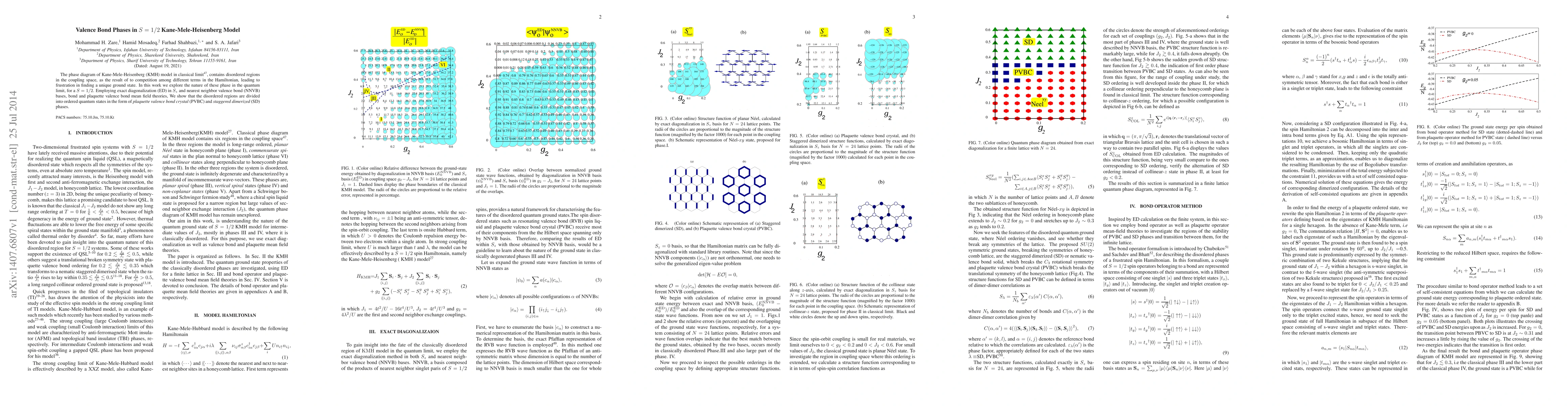 The phase diagram of Kane-Mele-Heisenberg (KMH) model in classical limit~\cite{zare}, contains disordered regions in the coupling space, as the result of to competition among different terms in the Hamiltonian, leading to frustration in finding a unique ground state. In this work we explore the nature of these phase in the quantum limit, for a $S=1/2$. Employing exact diagonalization (ED) in $S_z$ and nearest neighbor valence bond (NNVB) bases, bond and plaquette valence bond mean field theories, We show that the disordered regions are divided into ordered quantum states in the form of plaquette valence bond crystal(PVBC) and staggered dimerized (SD) phases.