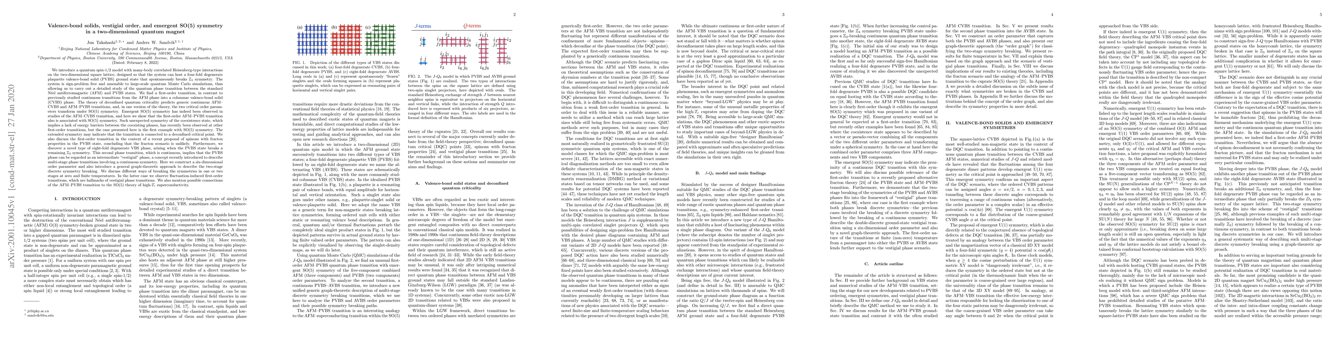 This paper introduces a quantum spin-1/2 model on a 2D square lattice that exhibits a first-order transition between antiferromagnetic and plaquette valence-bond solid states, revealing an emergent SO(5) symmetry and a novel eight-fold degenerate VBS phase, suggesting a two-stage discrete symmetry breaking process.