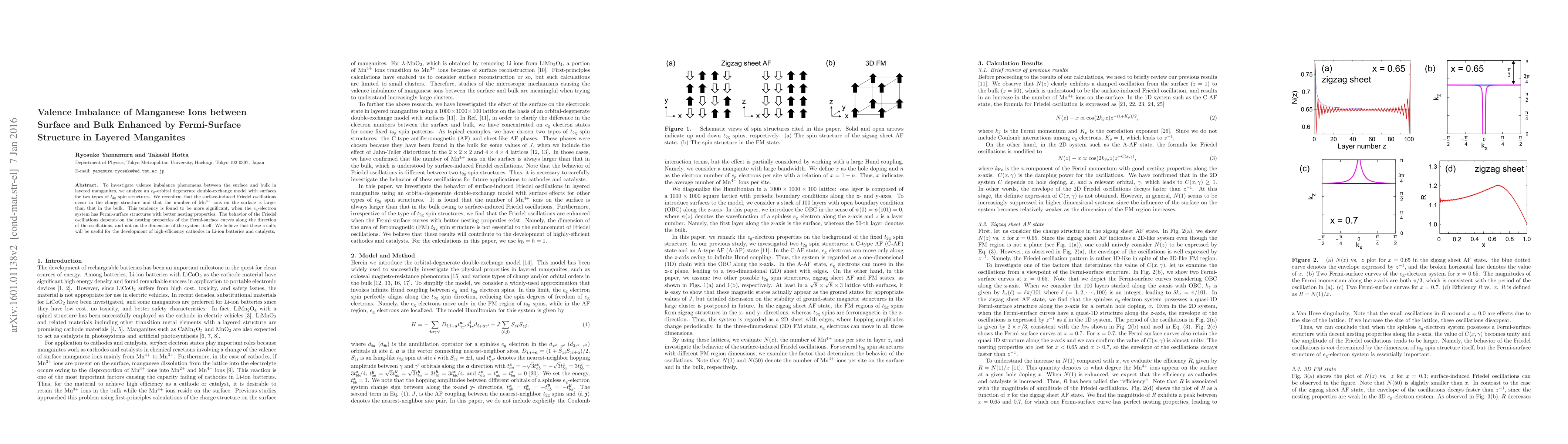 This study uses a double-exchange model to demonstrate that layered manganites exhibit a valence imbalance, with more Mn4+ ions on the surface than in the bulk, particularly when the Fermi-surface structures have good nesting properties. The findings suggest potential applications in Li-ion battery cathodes and catalyst development.