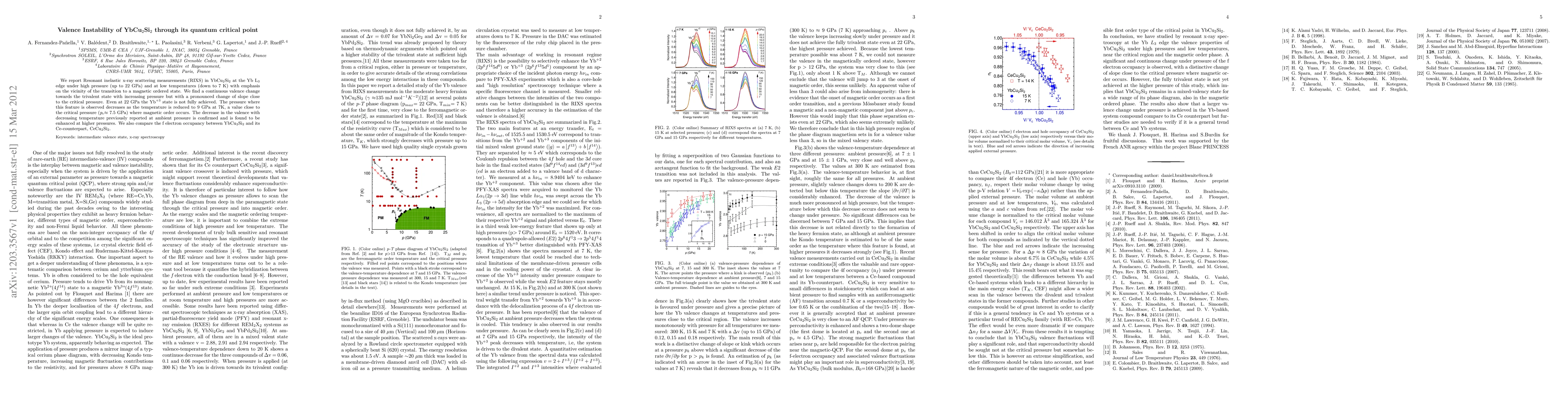 We report Resonant inelastic x-ray scattering measurements (RIXS) in YbCu$_2$Si$_2$ at the Yb L$_{3}$ edge under high pressure (up to 22 GPa) and at low temperatures (down to 7 K) with emphasis on the vicinity of the transition to a magnetic ordered state. We find a continuous valence change towards the trivalent state with increasing pressure but with a pronounced change of slope close to the critical pressure. Even at 22 GPa the Yb$^{+3}$ state is not fully achieved. The pressure where this feature is observed decreases as the temperature is reduced to 9 GPa at 7K, a value close to the critical pressure (\itshape{p\normalfont{$_c$}}\normalfont $\approx$ 7.5 GPa) where magnetic order occurs. The decrease in the valence with decreasing temperature previously reported at ambient pressure is confirmed and is found to be enhanced at higher pressures. We also compare the f electron occupancy between YbCu$_2$Si$_2$ and its Ce-counterpart, CeCu$_2$Si$_2$.