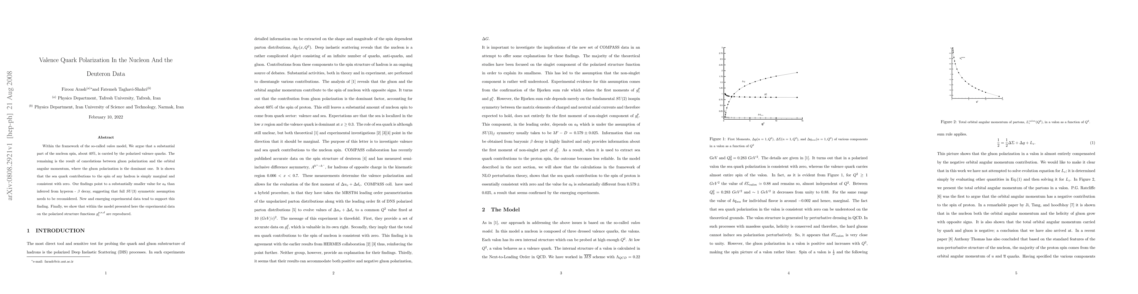Within the framework of the so-called "valon" model, we argue that a substantial part of the nucleon spin, about 40%, is carried by the polarized valence quarks. The remaining is the result of cancellations between gluon polarization and the orbital angular momentum, where the gluon polarization is the dominant one. It is shown that the sea quark contribution to the spin of any hadron is simply marginal and consistent with zero. Our findings point to a substantially smaller value for a_8 thaninferred from hyperon- $\beta$ decay, suggesting that fullSU(3) symmetric assumption needs to be reconsidered. New and emerging experimental data tend to support this finding. Finally, we show that within the model described here the experimental data on the polarized structure functions $g_{1}^{p,n,d}$ are reproduced.