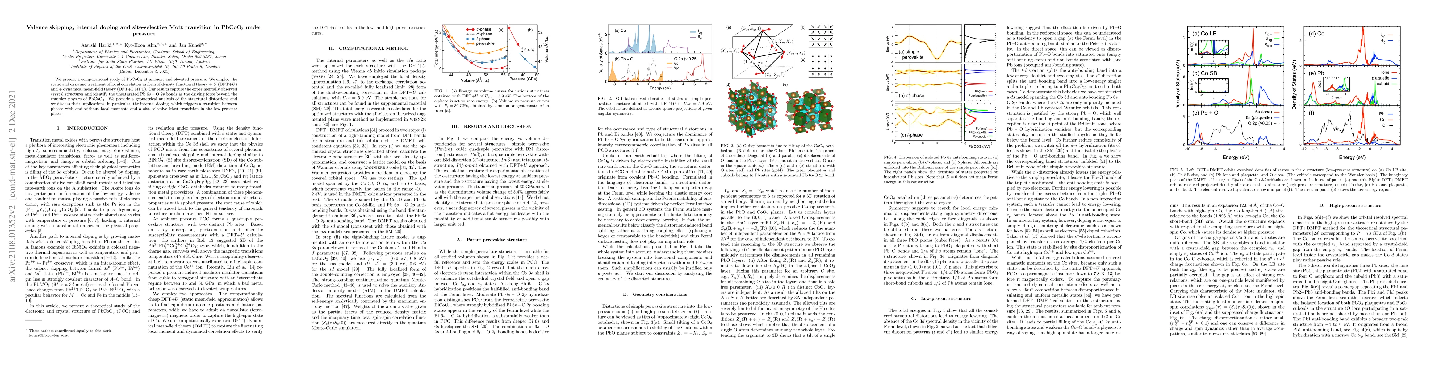This study investigates PbCoO$_3$ under varying pressures using DFT+$U$ and DFT+DMFT methods, revealing that unsaturated Pb $6s$ - O $2p$ bonds drive complex physics. The research highlights the internal doping effects and a site-selective Mott transition, particularly in the low-pressure phase.