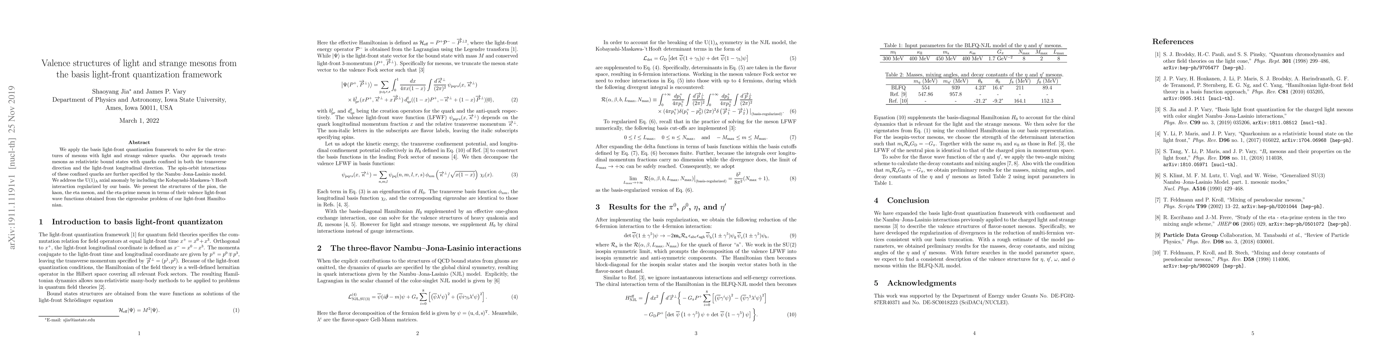 We apply the basis light-front quantization framework to solve for the structures of mesons with light and strange valence quarks. Our approach treats mesons as relativistic bound states with quarks confined in both the transverse direction and the light-front longitudinal direction. The spin-orbit interactions of these confined quarks are further specified by the Nambu--Jona-Lasinio model. We address the $\mathrm{U}(1)_{\mathrm{A}}$ axial anomaly by including the Kobayashi-Maskawa-'t Hooft interaction regularized by our basis. We present the structures of the pion, the kaon, the eta meson, and the eta-prime meson in terms of their valence light-front wave functions obtained from the eigenvalue problem of our light-front Hamiltonian.