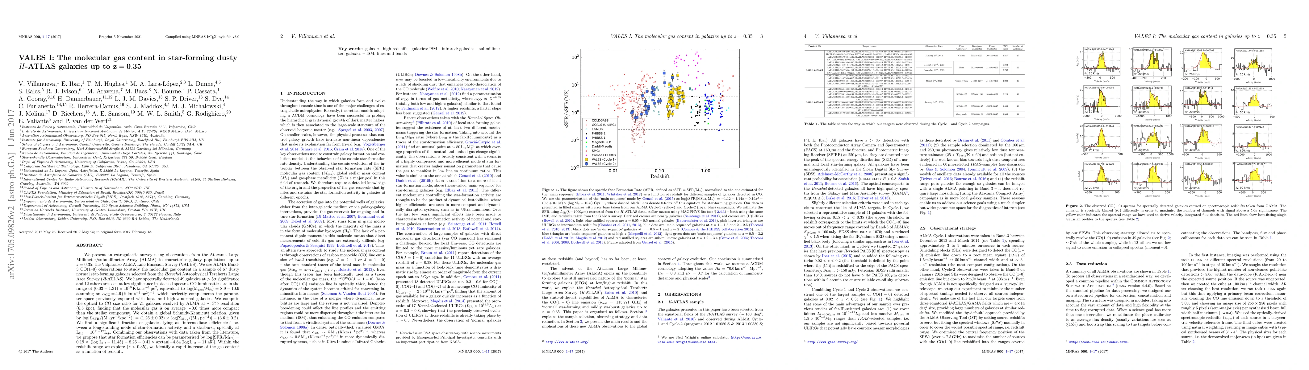 We present an extragalactic survey using observations from the Atacama Large Millimeter/submillimeter Array (ALMA) to characterise galaxy populations up to $z=0.35$: the Valpara\'iso ALMA Line Emission Survey (VALES). We use ALMA Band-3 CO(1--0) observations to study the molecular gas content in a sample of 67 dusty normal star-forming galaxies selected from the $Herschel$ Astrophysical Terahertz Large Area Survey ($H$-ATLAS). We have spectrally detected 49 galaxies at $>5\sigma$ significance and 12 others are seen at low significance in stacked spectra. CO luminosities are in the range of $(0.03-1.31)\times10^{10}$ K km s$^{-1}$ pc$^2$, equivalent to $\log({\rm M_{gas}/M_{\odot}}) =8.9-10.9$ assuming an $\alpha_{\rm CO}$=4.6(K km s$^{-1}$ pc$^{2}$)$^{-1}$, which perfectly complements the parameter space previously explored with local and high-z normal galaxies. We compute the optical to CO size ratio for 21 galaxies resolved by ALMA at $\sim 3$."$5$ resolution (6.5 kpc), finding that the molecular gas is on average $\sim$ 0.6 times more compact than the stellar component. We obtain a global Schmidt-Kennicutt relation, given by $\log [\Sigma_{\rm SFR}/({\rm M_{\odot} yr^{-1}kpc^{-2}})]=(1.26 \pm 0.02) \times \log [\Sigma_{\rm M_{H2}}/({\rm M_{\odot}\,pc^{-2}})]-(3.6 \pm 0.2)$. We find a significant fraction of galaxies lying at `intermediate efficiencies' between a long-standing mode of star-formation activity and a starburst, specially at $\rm L_{IR}=10^{11-12} L_{\odot}$. Combining our observations with data taken from the literature, we propose that star formation efficiencies can be parameterised by $\log [{\rm SFR/M_{H2}}]=0.19 \times {\rm (\log {L_{IR}}-11.45)}-8.26-0.41 \times \arctan[-4.84 (\log {\rm L_{IR}}-11.45) ]$. Within the redshift range we explore ($z<0.35$), we identify a rapid increase of the gas content as a function of redshift.