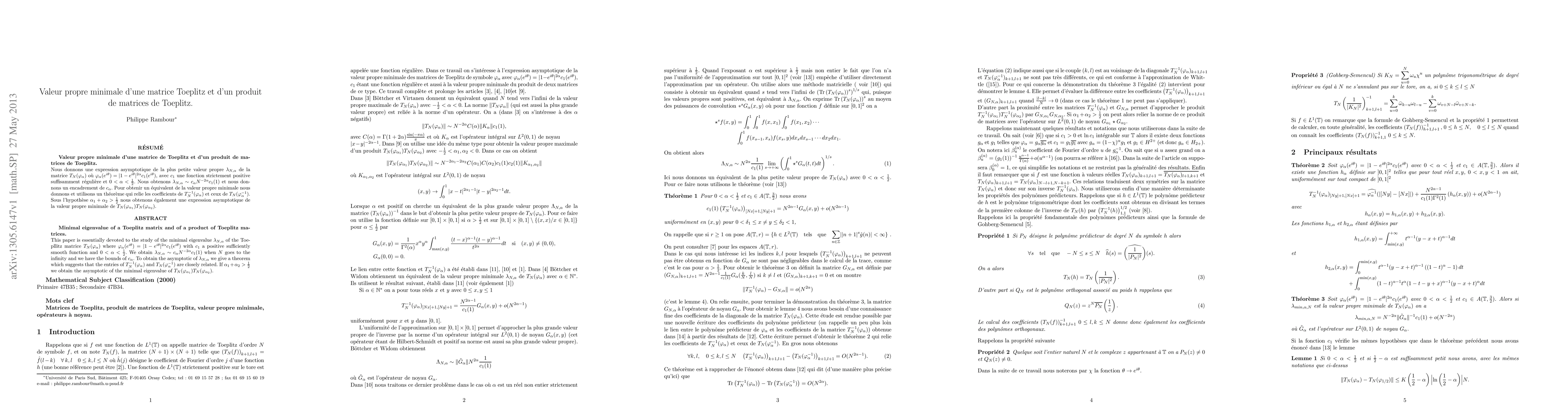 This paper is essentially devoted to the study of the minimal eigenvalue $\lambda_{N,\alpha}$ of the Toepllitz matrice $T_N(\varphi_{\alpha})$ where $\varphi_{\alpha}(e^{i \theta})=|1- e^{i \theta} |^{2\alpha} c_{1}(e^{i \theta})$ with $c_{1}$ a positive sufficiently smooth function and $0<\alpha<\frac{1}{2}$. We obtain $\lambda_{N,\alpha}\sim c_{\alpha}N^{-2\alpha}c_{1}(1)$ when $N$ goes to the infinity and we have the bounds of $c_{\alpha}$. To obtain the asymptotic of $\lambda_{N,\alpha}$ we give a theorem which suggests that the entries of $T_N^{-1}(\varphi_{\alpha})$ and $T_N (\varphi^{-1}_\alpha)$ are closely related. If $\alpha_1 + \alpha_2 > \frac{1}{2}$ we obtain the asymptotic of the minimal eigenvalue of $T_N (\varphi_{\alpha_1}) T_N (\varphi_{\alpha_2}).$