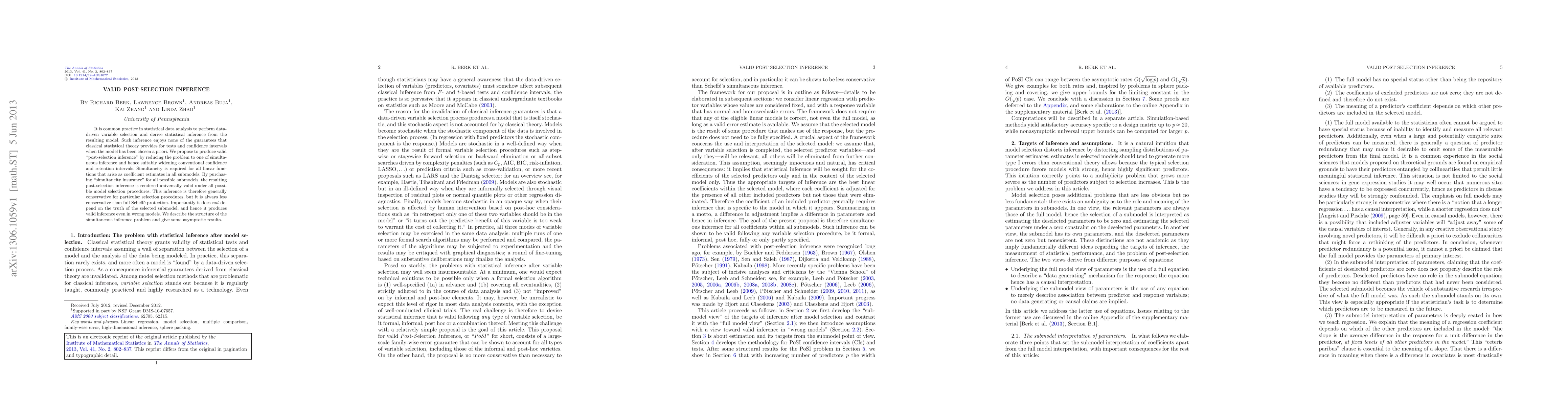 This paper proposes a method for valid post-selection inference in statistical data analysis, addressing the lack of guarantees in traditional methods after data-driven variable selection. It achieves this by employing simultaneous inference to widen confidence and retention intervals, ensuring universally valid results regardless of the selection procedure used.