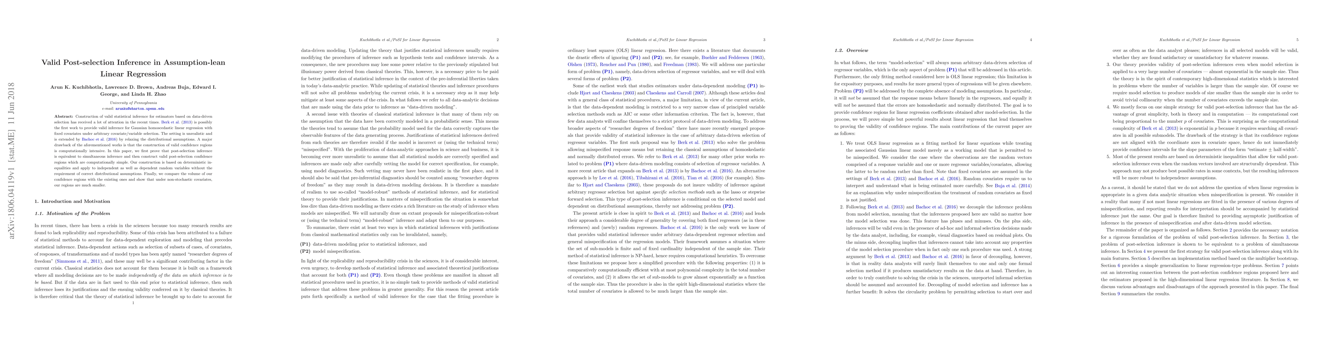 This paper presents a computationally efficient method for constructing valid post-selection confidence regions in linear regression, proving their equivalence to simultaneous inference. It achieves this without requiring strict distributional assumptions, offering smaller confidence regions compared to existing methods.