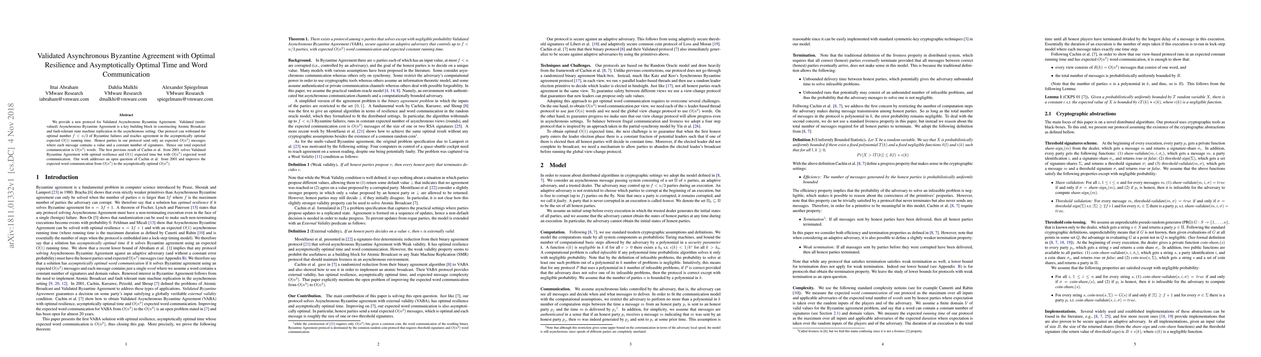 The paper introduces an improved protocol for Validated Asynchronous Byzantine Agreement with optimal resilience and asymptotically optimal time and word communication complexities.