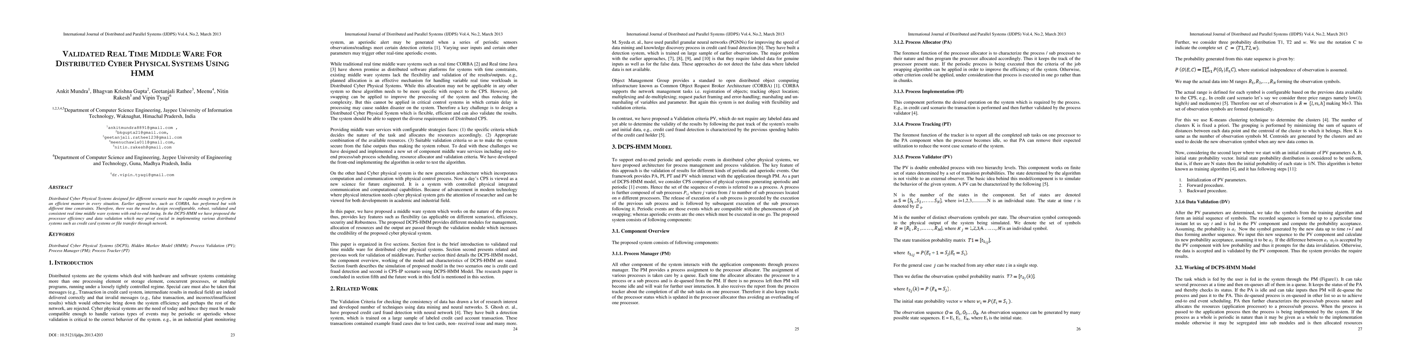 Distributed Cyber Physical Systems designed for different scenario must be capable enough to perform in an efficient manner in every situation. Earlier approaches, such as CORBA, has performed but with different time constraints. Therefore, there was the need to design reconfigurable, robust, validated and consistent real time middle ware systems with end-to-end timing. In the DCPS-HMM we have proposed the processor efficiency and data validation which may proof crucial in implementing various distributed systems such as credit card systems or file transfer through network.