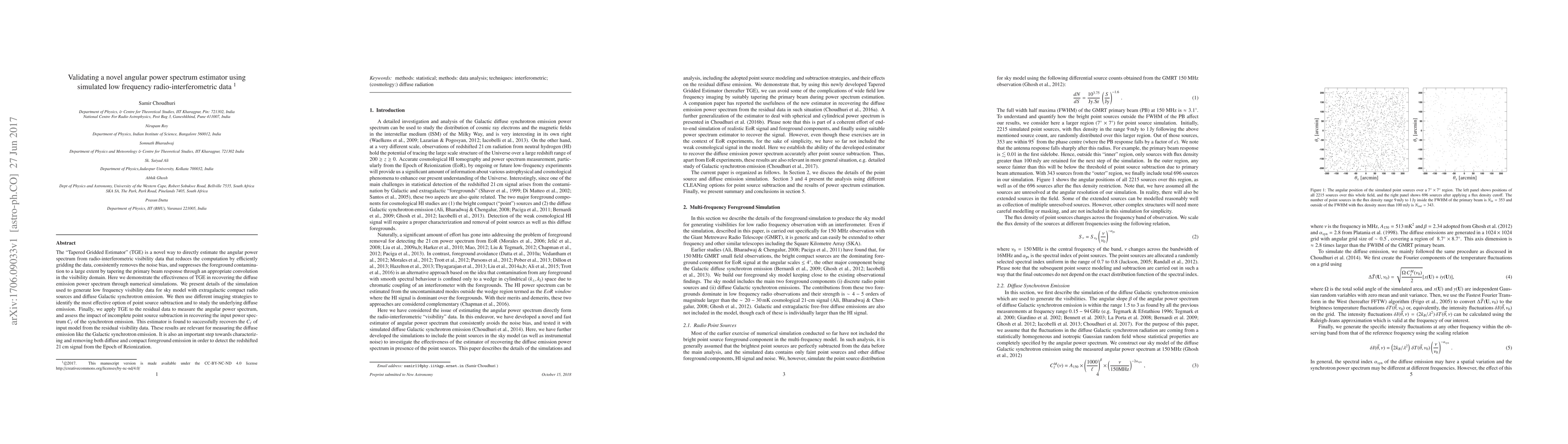 The "Tapered Gridded Estimator" (TGE) effectively estimates the angular power spectrum from low-frequency radio-interferometric data, reducing noise bias and foreground contamination. Simulation results show TGE successfully recovers the input power spectrum of diffuse Galactic synchrotron emission, aiding in the detection of the redshifted $21$ cm signal from the Epoch of Reionization.
