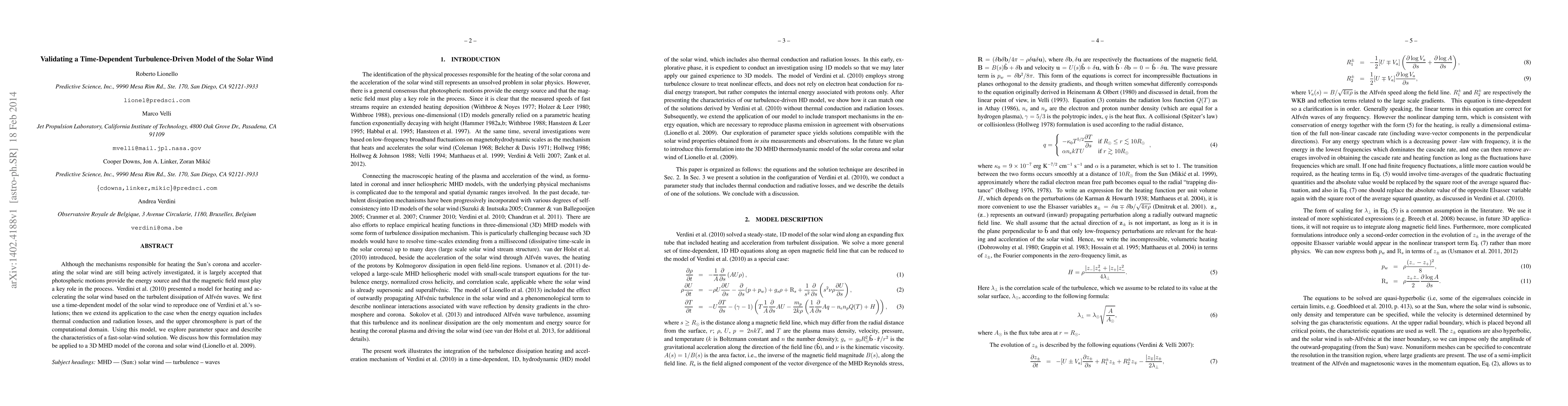 This paper validates a time-dependent wave-turbulence model for solar wind acceleration, incorporating thermal conduction and radiation losses. It extends the model to include the upper chromosphere and discusses its potential integration into a 3D MHD model for the corona and solar wind.