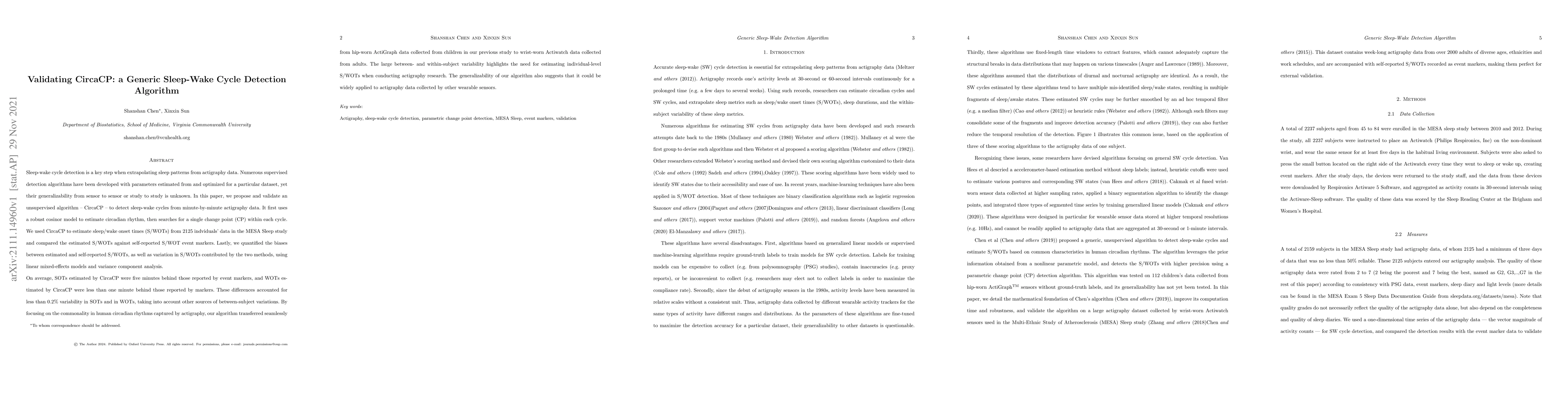 Sleep-wake cycle detection is a key step when extrapolating sleep patterns from actigraphy data. Numerous supervised detection algorithms have been developed with parameters estimated from and optimized for a particular dataset, yet their generalizability from sensor to sensor or study to study is unknown. In this paper, we propose and validate an unsupervised algorithm -- CircaCP -- to detect sleep-wake cycles from minute-by-minute actigraphy data. It first uses a robust cosinor model to estimate circadian rhythm, then searches for a single change point (CP) within each cycle. We used CircaCP to estimate sleep/wake onset times (S/WOTs) from 2125 indviduals' data in the MESA Sleep study and compared the estimated S/WOTs against self-reported S/WOT event markers. Lastly, we quantified the biases between estimated and self-reported S/WOTs, as well as variation in S/WOTs contributed by the two methods, using linear mixed-effects models and variance component analysis. On average, SOTs estimated by CircaCP were five minutes behind those reported by event markers, and WOTs estimated by CircaCP were less than one minute behind those reported by markers. These differences accounted for less than 0.2% variability in SOTs and in WOTs, taking into account other sources of between-subject variations. By focusing on the commonality in human circadian rhythms captured by actigraphy, our algorithm transferred seamlessly from hip-worn ActiGraph data collected from children in our previous study to wrist-worn Actiwatch data collected from adults. The large between- and within-subject variability highlights the need for estimating individual-level S/WOTs when conducting actigraphy research. The generalizability of our algorithm also suggests that it could be widely applied to actigraphy data collected by other wearable sensors.