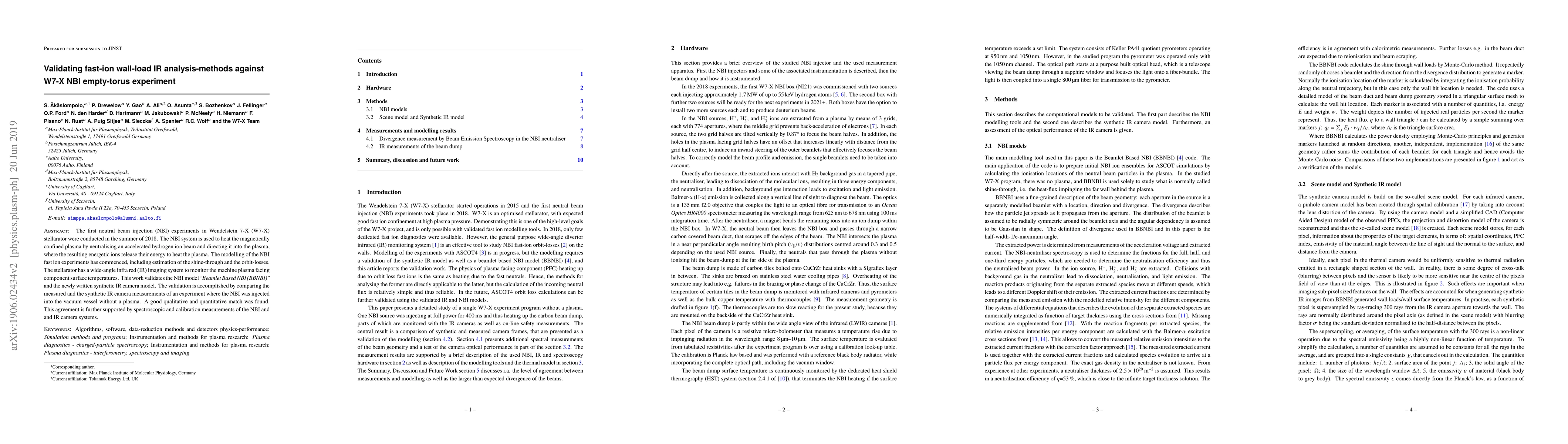 This paper validates the "Beamlet Based NBI" model and a synthetic IR camera model against W7-X NBI empty-torus experiments, finding good qualitative and quantitative agreement between measured and synthetic IR camera data. The validation is supported by spectroscopic and calibration measurements.