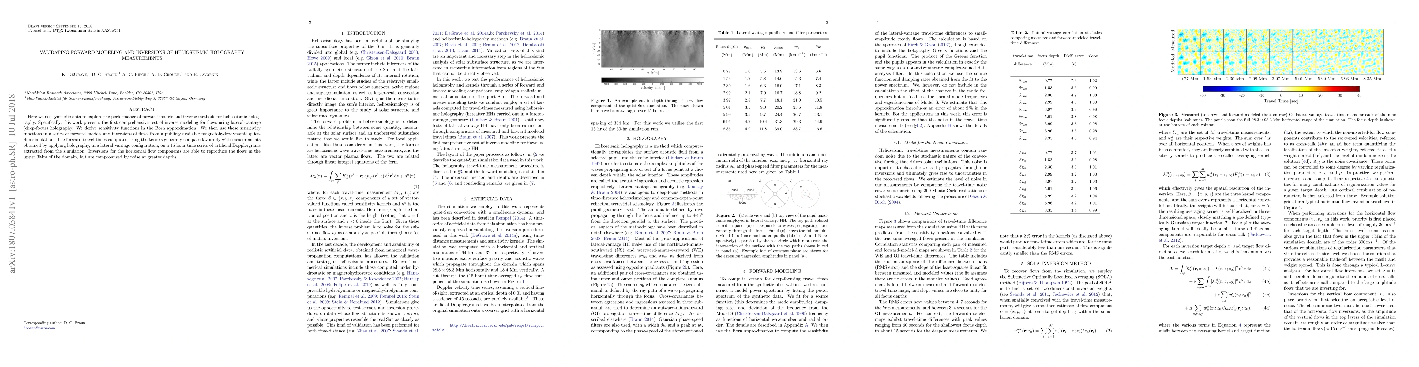 This paper validates forward modeling and inversion techniques for helioseismic holography using synthetic data, demonstrating successful inversion of horizontal flows in the upper 3Mm from a magnetohydrodynamic simulation, though noise affects deeper layers. Sensitivity functions derived in the Born approximation are key to these results.