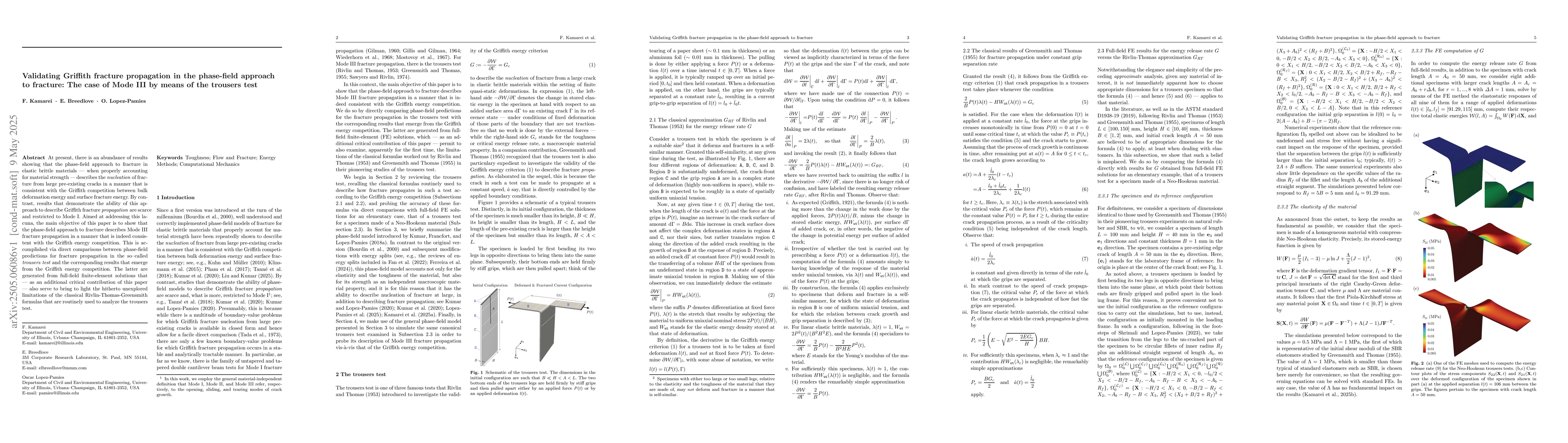 The paper presents a critical examination of the phase-field approach for Mode III fracture propagation, validating it against Griffith's energy competition and exposing the limitations of classical Rivlin-Thomas-Greensmith formulas in the trousers test analysis.
