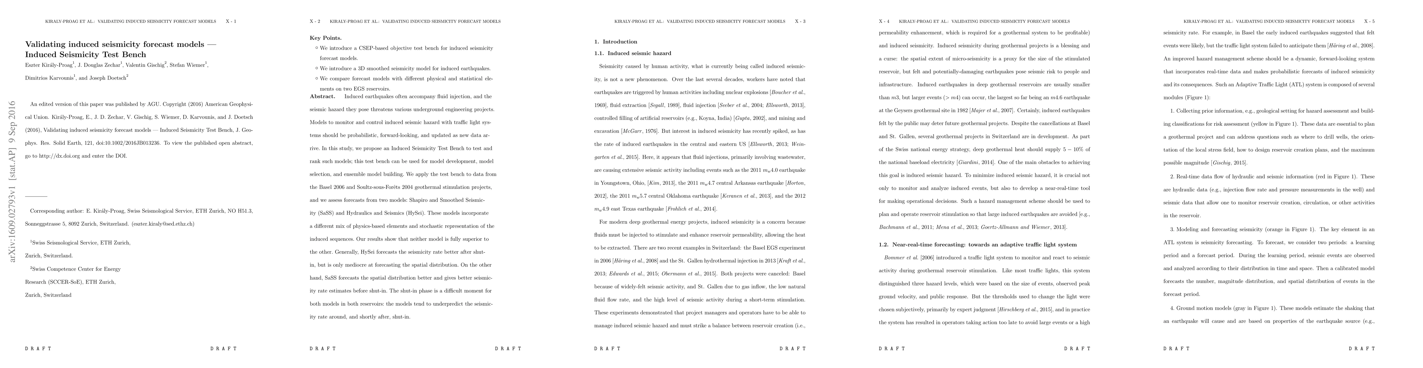 Induced earthquakes often accompany fluid injection, and the seismic hazard they pose threatens various underground engineering projects. Models to monitor and control induced seismic hazard with traffic light systems should be probabilistic, forward-looking, and updated as new data arrive. In this study, we propose an Induced Seismicity Test Bench to test and rank such models; this test bench can be used for model development, model selection, and ensemble model building. We apply the test bench to data from the Basel 2006 and Soultz-sous-For\^ets 2004 geothermal stimulation projects, and we assess forecasts from two models: Shapiro and Smoothed Seismicity (SaSS) and Hydraulics and Seismics (HySei). These models incorporate a different mix of physics-based elements and stochastic representation of the induced sequences. Our results show that neither model is fully superior to the other. Generally, HySei forecasts the seismicity rate better after shut-in, but is only mediocre at forecasting the spatial distribution. On the other hand, SaSS forecasts the spatial distribution better and gives better seismicity rate estimates before shut-in. The shut-in phase is a difficult moment for both models in both reservoirs: the models tend to underpredict the seismicity rate around, and shortly after, shut-in.