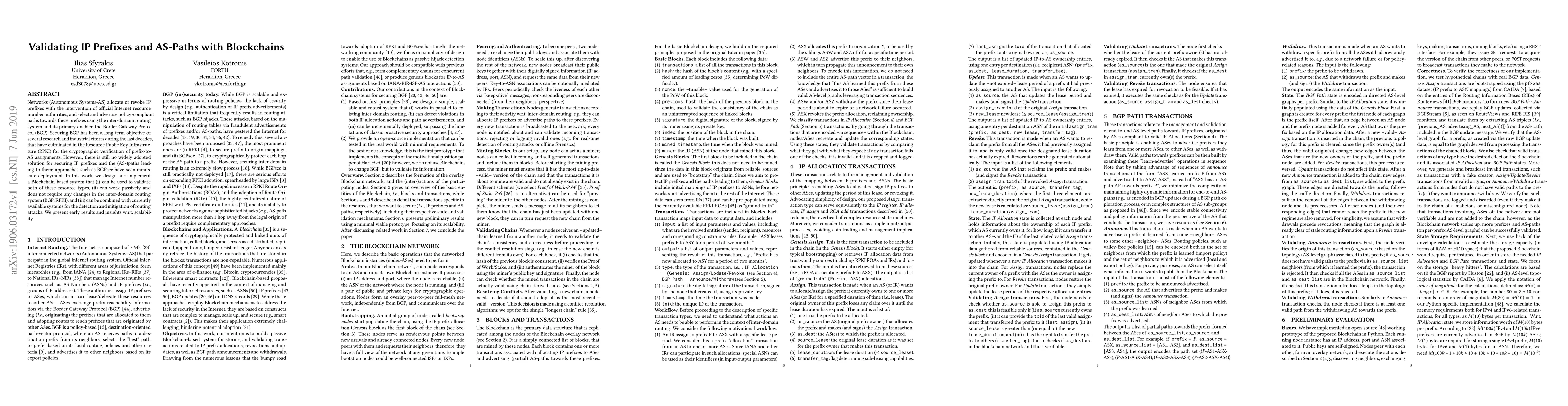 This paper proposes a Blockchain-based system to validate IP prefixes and AS-paths without modifying inter-domain routing systems, with early results on scalability.