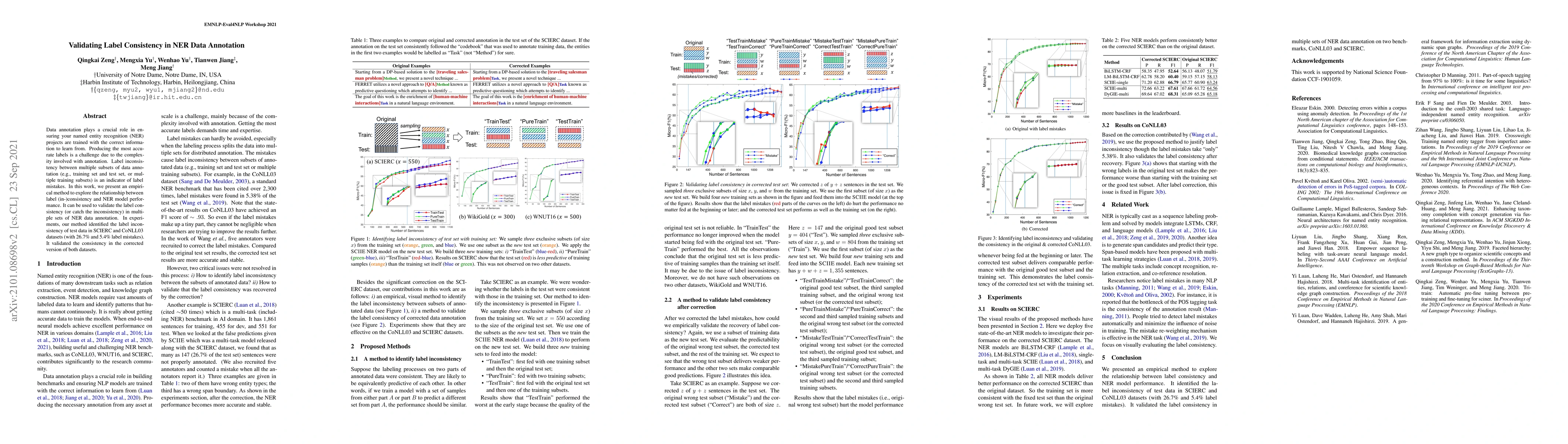 Data annotation plays a crucial role in ensuring your named entity recognition (NER) projects are trained with the right information to learn from. Producing the most accurate labels is a challenge due to the complexity involved with annotation. Label inconsistency between multiple subsets of data annotation (e.g., training set and test set, or multiple training subsets) is an indicator of label mistakes. In this work, we present an empirical method to explore the relationship between label (in-)consistency and NER model performance. It can be used to validate the label consistency (or catches the inconsistency) in multiple sets of NER data annotation. In experiments, our method identified the label inconsistency of test data in SCIERC and CoNLL03 datasets (with 26.7% and 5.4% label mistakes). It validated the consistency in the corrected version of both datasets.