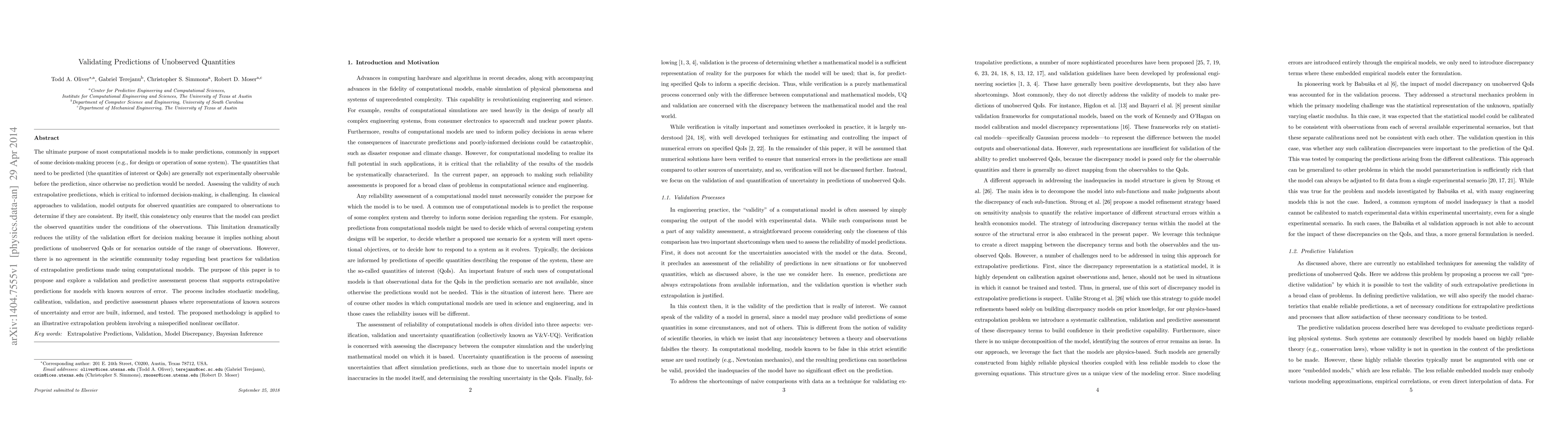 The ultimate purpose of most computational models is to make predictions, commonly in support of some decision-making process (e.g., for design or operation of some system). The quantities that need to be predicted (the quantities of interest or QoIs) are generally not experimentally observable before the prediction, since otherwise no prediction would be needed. Assessing the validity of such extrapolative predictions, which is critical to informed decision-making, is challenging. In classical approaches to validation, model outputs for observed quantities are compared to observations to determine if they are consistent. By itself, this consistency only ensures that the model can predict the observed quantities under the conditions of the observations. This limitation dramatically reduces the utility of the validation effort for decision making because it implies nothing about predictions of unobserved QoIs or for scenarios outside of the range of observations. However, there is no agreement in the scientific community today regarding best practices for validation of extrapolative predictions made using computational models. The purpose of this paper is to propose and explore a validation and predictive assessment process that supports extrapolative predictions for models with known sources of error. The process includes stochastic modeling, calibration, validation, and predictive assessment phases where representations of known sources of uncertainty and error are built, informed, and tested. The proposed methodology is applied to an illustrative extrapolation problem involving a misspecified nonlinear oscillator.