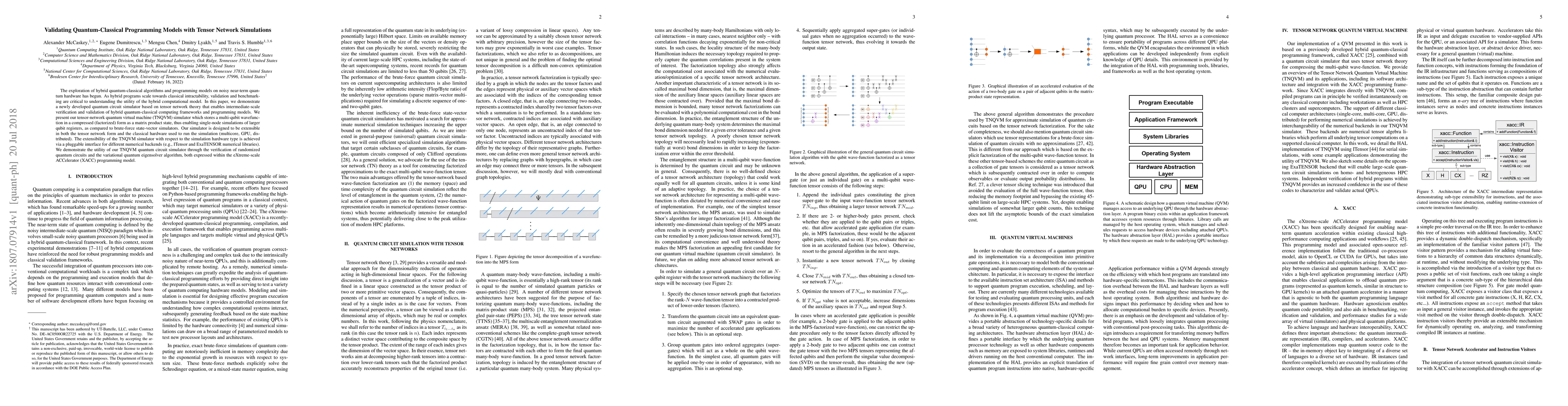 This paper introduces a tensor network-based quantum circuit simulator, TNQVM, for validating hybrid quantum-classical programming models on near-term quantum hardware. The TNQVM compresses multi-qubit wavefunctions as matrix product states, enabling simulations of larger qubit registers than traditional methods, and demonstrates its utility through randomized quantum circuits and the variational quantum eigensolver algorithm.