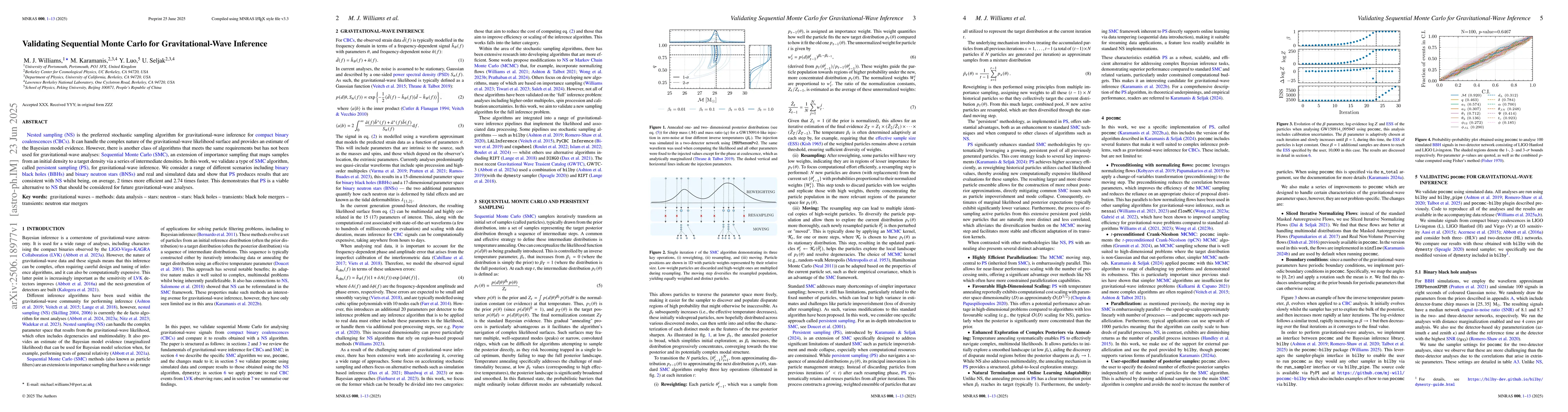 This research validates Persistent Sampling (PS), a type of Sequential Monte Carlo algorithm, for gravitational-wave inference, showing it's as accurate as the preferred Nested Sampling (NS) but 2 times more efficient and 2.74 times faster. It suggests PS as a promising alternative for future gravitational-wave data analysis.