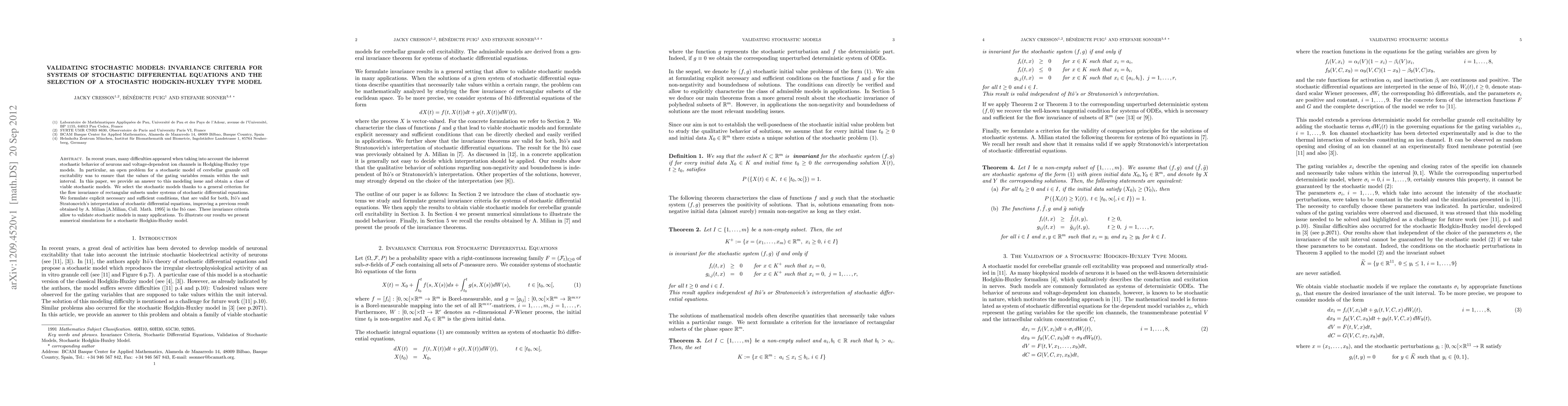 In recent years, many difficulties appeared when taking into account the inherent stochastic behavior of neurons and voltage-dependent ion channels in Hodgking-Huxley type models. In particular, an open problem for a stochastic model of cerebellar granule cell excitability was to ensure that the values of the gating variables remain within the unit interval. In this paper, we provide an answer to this modeling issue and obtain a class of viable stochastic models. We select the stochastic models thanks to a general criterion for the flow invariance of rectangular subsets under systems of stochastic differential equations. We formulate explicit necessary and sufficient conditions, that are valid for both, It\^o's and Stratonovich's interpretation of stochastic differential equations, improving a previous result obtained by A. Milian [A.Milian, Coll. Math. 1995] in the It\^o case. These invariance criteria allow to validate stochastic models in many applications. To illustrate our results we present numerical simulations for a stochastic Hodgkin-Huxley model.