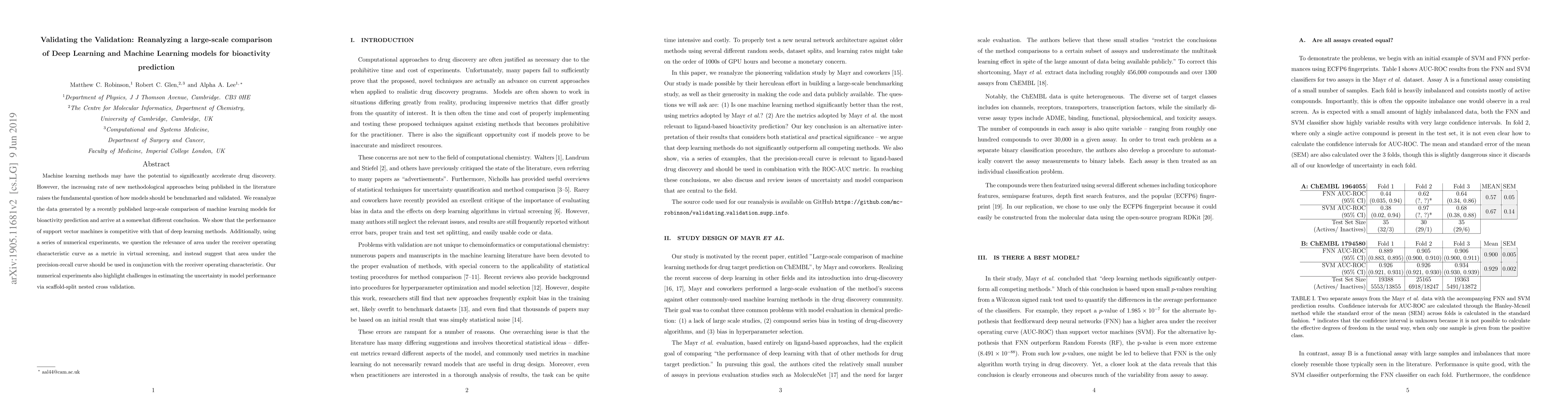 Machine learning methods may have the potential to significantly accelerate drug discovery. However, the increasing rate of new methodological approaches being published in the literature raises the fundamental question of how models should be benchmarked and validated. We reanalyze the data generated by a recently published large-scale comparison of machine learning models for bioactivity prediction and arrive at a somewhat different conclusion. We show that the performance of support vector machines is competitive with that of deep learning methods. Additionally, using a series of numerical experiments, we question the relevance of area under the receiver operating characteristic curve as a metric in virtual screening, and instead suggest that area under the precision-recall curve should be used in conjunction with the receiver operating characteristic. Our numerical experiments also highlight challenges in estimating the uncertainty in model performance via scaffold-split nested cross validation.
