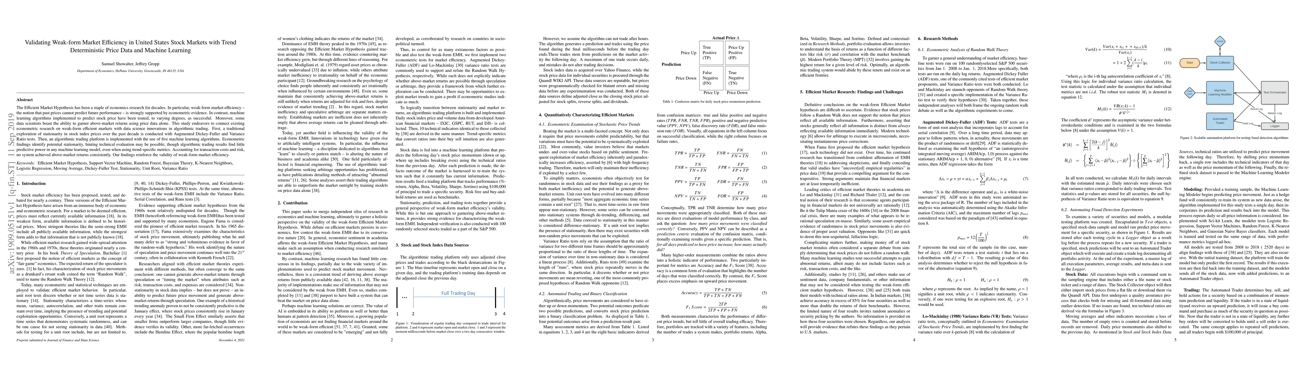 The Efficient Market Hypothesis has been a staple of economics research for decades. In particular, weak-form market efficiency -- the notion that past prices cannot predict future performance -- is strongly supported by econometric evidence. In contrast, machine learning algorithms implemented to predict stock price have been touted, to varying degrees, as successful. Moreover, some data scientists boast the ability to garner above-market returns using price data alone. This study endeavors to connect existing econometric research on weak-form efficient markets with data science innovations in algorithmic trading. First, a traditional exploration of stationarity in stock index prices over the past decade is conducted with Augmented Dickey-Fuller and Variance Ratio tests. Then, an algorithmic trading platform is implemented with the use of five machine learning algorithms. Econometric findings identify potential stationarity, hinting technical evaluation may be possible, though algorithmic trading results find little predictive power in any machine learning model, even when using trend-specific metrics. Accounting for transaction costs and risk, no system achieved above-market returns consistently. Our findings reinforce the validity of weak-form market efficiency.