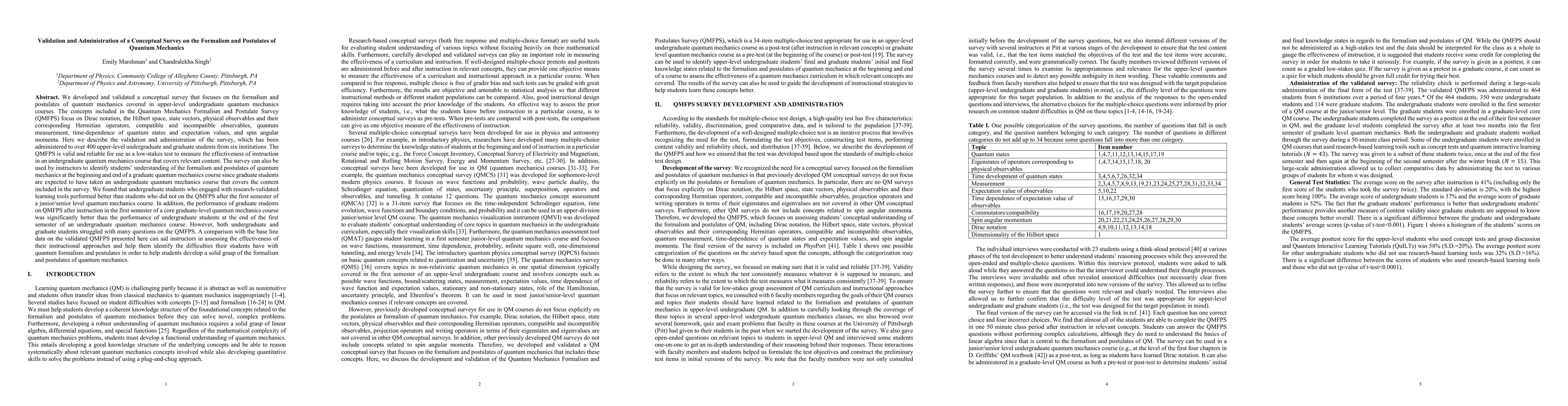 This paper describes the development and validation of a conceptual survey, the Quantum Mechanics Formalism and Postulate Survey (QMFPS), to assess understanding of quantum mechanics concepts among upper-level undergraduates and graduate students. The survey shows high validity and reliability, and its administration to over 400 students across six institutions indicates its effectiveness in measuring instructional impact.