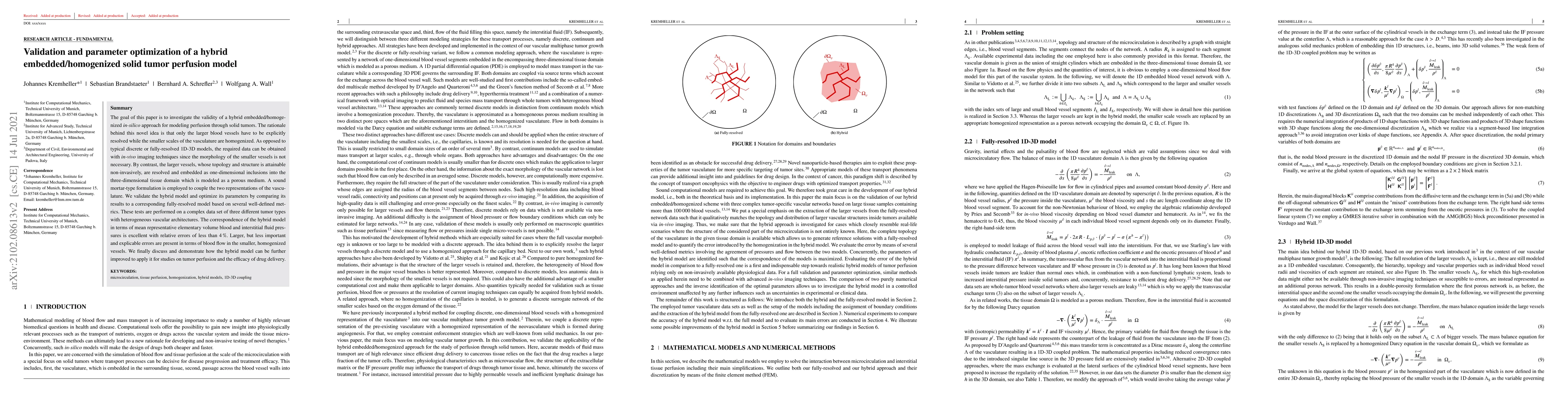 This paper validates a hybrid embedded/homogenized in-silico model for simulating solid tumor perfusion, showing excellent agreement with fully-resolved models for blood and interstitial fluid pressures with less than 4% error. The hybrid approach resolves larger vessels explicitly while homogenizing smaller ones, simplifying data acquisition via in-vivo imaging.