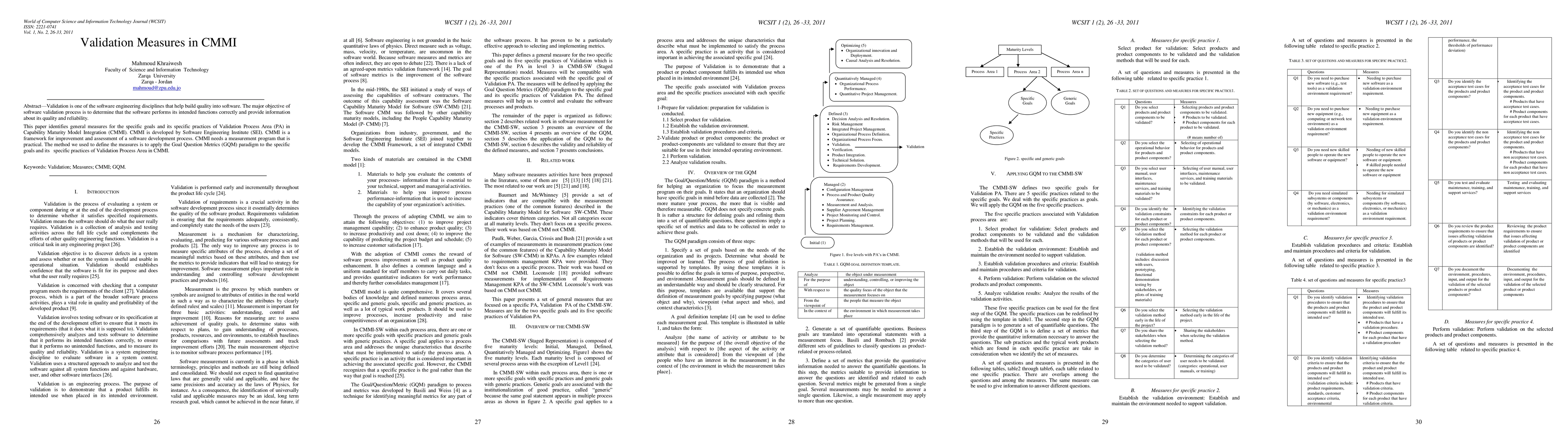 The research applies the Goal Question Metrics (GQM) paradigm to the Validation Process Area (PA) in Capability Maturity Model Integration (CMMI-SW) to identify a set of general measures.
