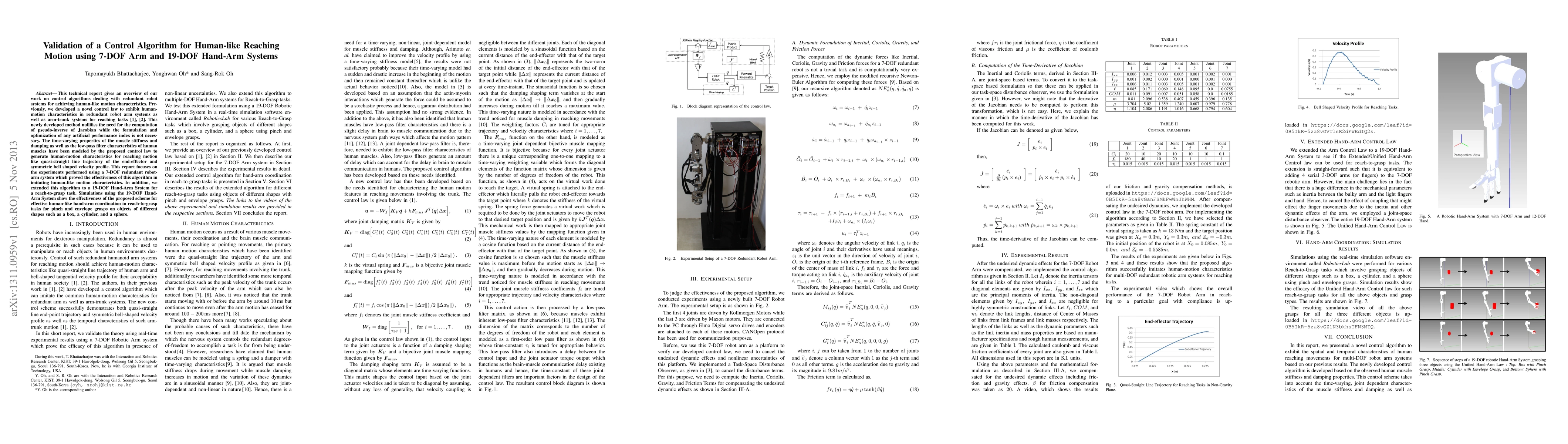 This technical report gives an overview of our work on control algorithms dealing with redundant robot systems for achieving human-like motion characteristics. Previously, we developed a novel control law to exhibit human-motion characteristics in redundant robot arm systems as well as arm-trunk systems for reaching tasks [1], [2]. This newly developed method nullifies the need for the computation of pseudo-inverse of Jacobian while the formulation and optimization of any artificial performance index is not necessary. The time-varying properties of the muscle stiffness and damping as well as the low-pass filter characteristics of human muscles have been modeled by the proposed control law to generate human-motion characteristics for reaching motion like quasi-straight line trajectory of the end-effector and symmetric bell shaped velocity profile. This report focuses on the experiments performed using a 7-DOF redundant robot-arm system which proved the effectiveness of this algorithm in imitating human-like motion characteristics. In addition, we extended this algorithm to a 19-DOF Hand-Arm System for a reach-to-grasp task. Simulations using the 19-DOF Hand-Arm System show the effectiveness of the proposed scheme for effective human-like hand-arm coordination in reach-to-grasp tasks for pinch and envelope grasps on objects of different shapes such as a box, a cylinder, and a sphere.
