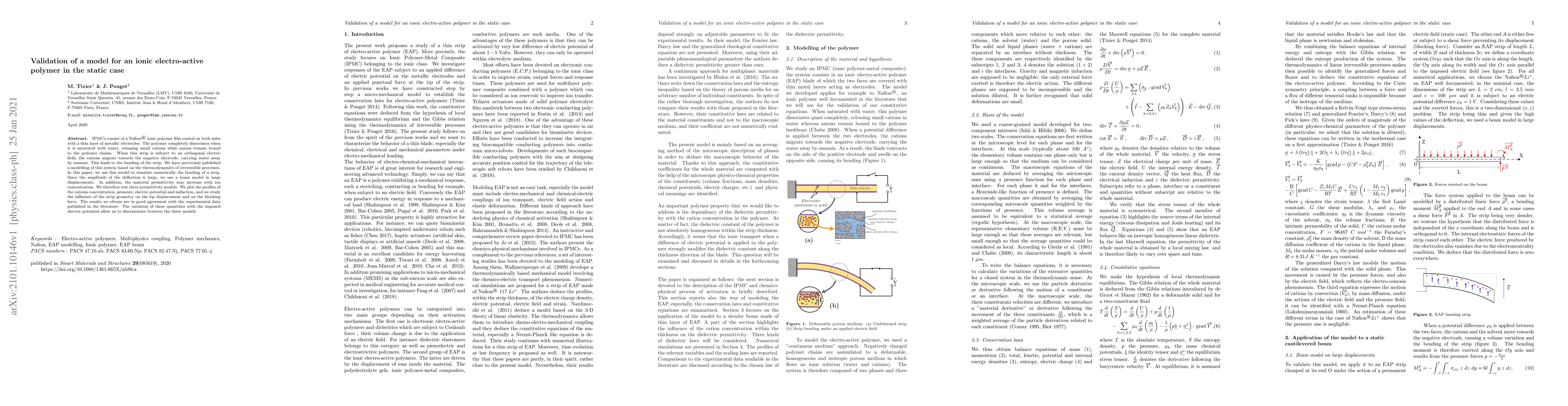 This paper validates a numerical model for Ion-Polymer Metal Composites (IPMCs) using thermodynamics of irreversible processes. Results match experimental data, showing concentration, pressure, potential, and induction profiles. The study tests three permittivity models, finding geometry influences tip displacement and blocking force, aiding in distinguishing between models.