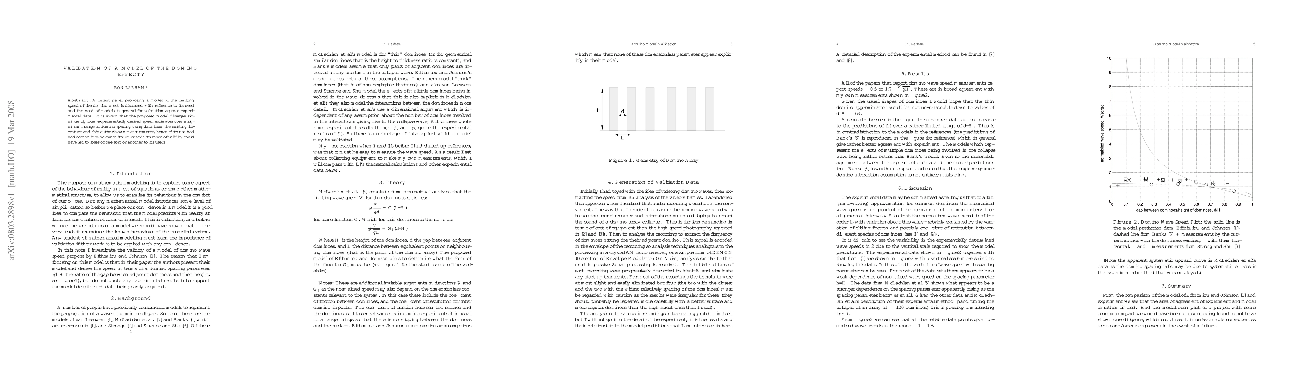 A recent paper proposing a model of the limiting speed of the domino effect is discussed with reference to its need and the need of models in general for validation against experimental data. It is shown that the proposed model diverges significantly from experimentally derived speed estimates over a significant range of domino spacing using data from the existing literature and this author's own measurements, hence if its use had had economic importance its use outside its range of validity could have led to loses of one sort or another to its users.