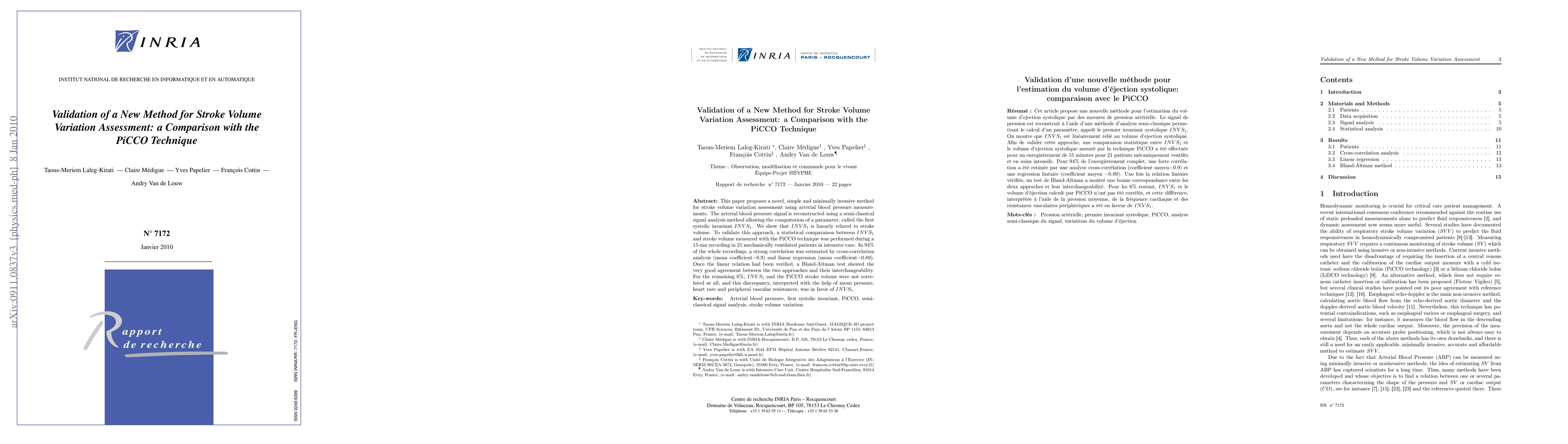 This paper proposes a novel, simple and minimally invasive method for stroke volume variation assessment using arterial blood pressure measurements. The arterial blood pressure signal is reconstructed using a semi-classical signal analysis method allowing the computation of a parameter, called the first systolic invariant INVS1. We show that INVS1 is linearly related to stroke volume. To validate this approach, a statistical comparaison between INVS1 and stroke volume measured with the PiCCO technique was performed during a 15-mn recording in 21 mechanically ventilated patients in intensive care. In 94% of the whole recordings, a strong correlation was estimated by cross-correlation analysis (mean coefficient=0.9) and linear regression (mean coefficient=0.89). Once the linear relation had been verified, a Bland-Altman test showed the very good agreement between the two approaches and their interchangeability. For the remaining 6%, INVS1 and the PiCCO stroke volume were not correlated at all, and this discrepancy, interpreted with the help of mean pressure, heart rate and peripheral vascular resistances, was in favor of INVS1.