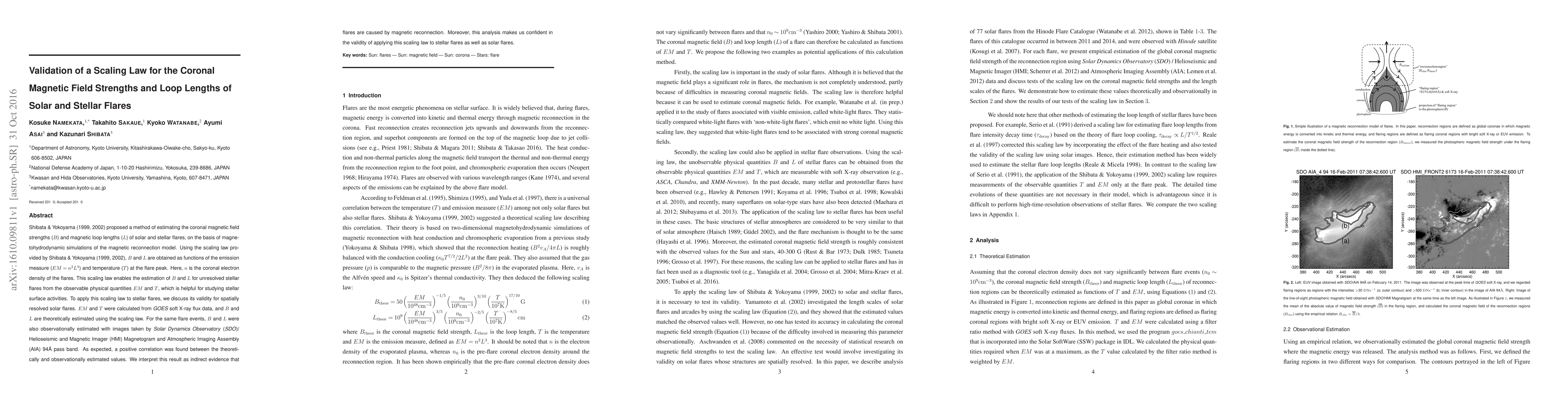 This paper validates a scaling law proposed by Shibata & Yokoyama for estimating coronal magnetic field strengths and loop lengths in solar and stellar flares, using solar flare data from SDO/HMI and AIA. The results show a positive correlation between theoretically and observationally estimated values, supporting the law's applicability to both solar and stellar flares.