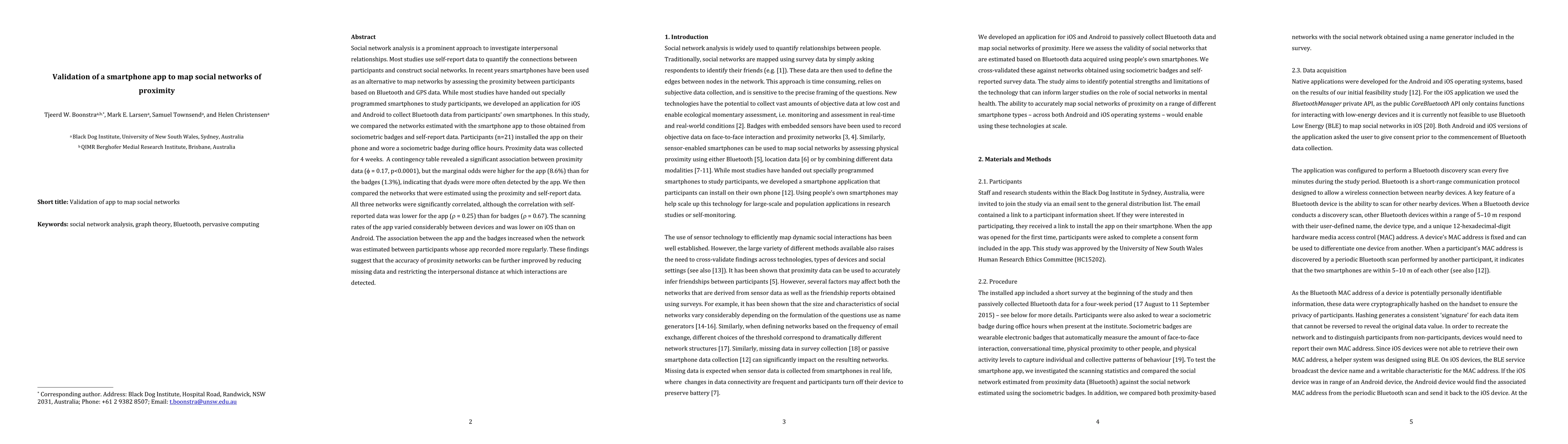 This study validates a smartphone app for mapping social networks based on proximity data against sociometric badges and self-report data. The app detected more dyads than badges, though correlations with self-reported data were lower, indicating room for improvement in accuracy.