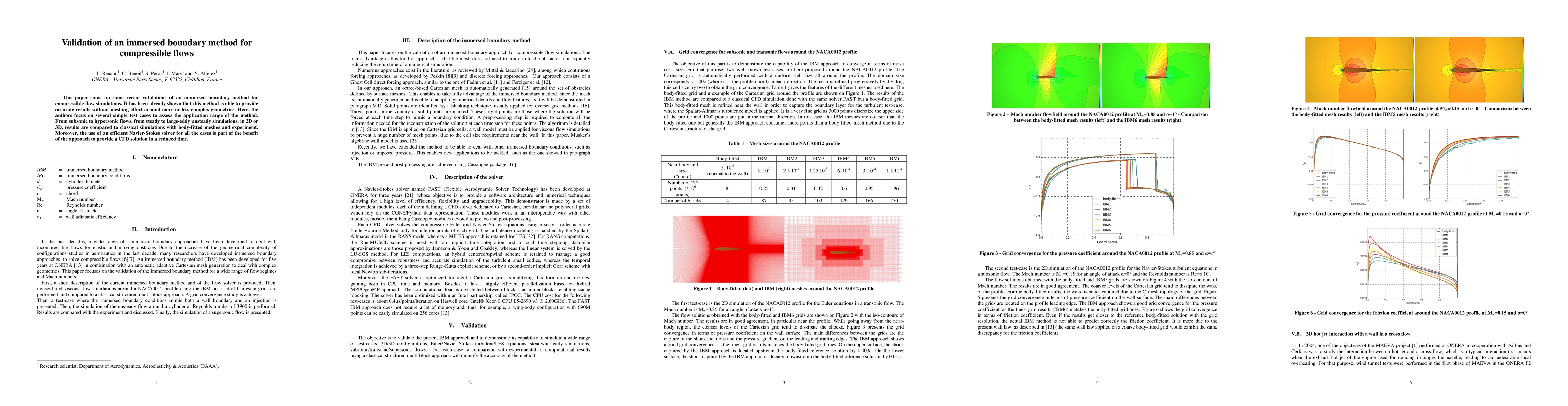 This paper validates an immersed boundary method for compressible flow simulations, demonstrating its accuracy across various flow regimes and geometries without the need for complex meshing. The method's efficiency is highlighted by its comparison to classical simulations and experiments, alongside its use of a fast Navier-Stokes solver.