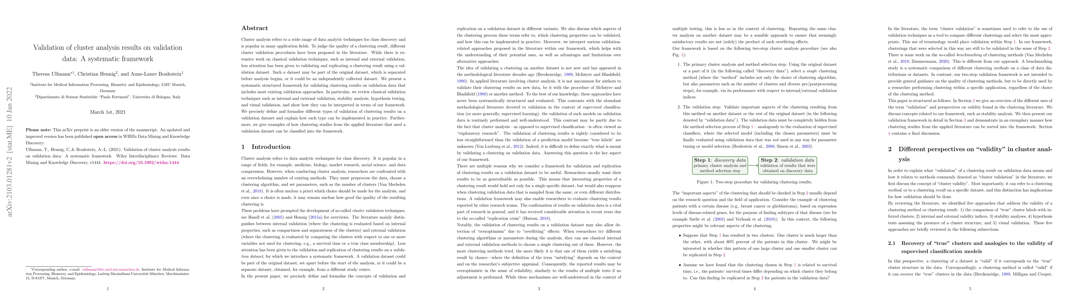 This paper proposes a systematic framework for validating clustering results using a validation dataset, reviewing classical validation techniques and detailing how they fit within the framework. It defines and formalizes different types of validation and provides practical implementation guidance, illustrated by examples from applied literature.