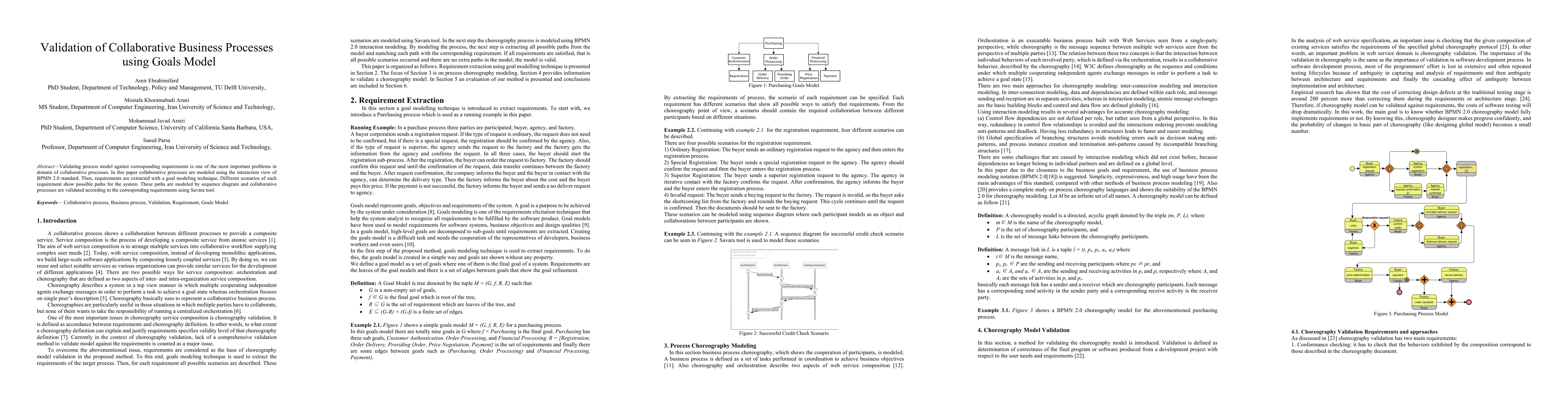 This paper presents a method to validate collaborative business processes by modeling them with BPMN 2.0 and extracting requirements via goal modeling. It uses sequence diagrams to demonstrate requirement scenarios and employs the Savara tool for validation, ensuring processes align with specified requirements.