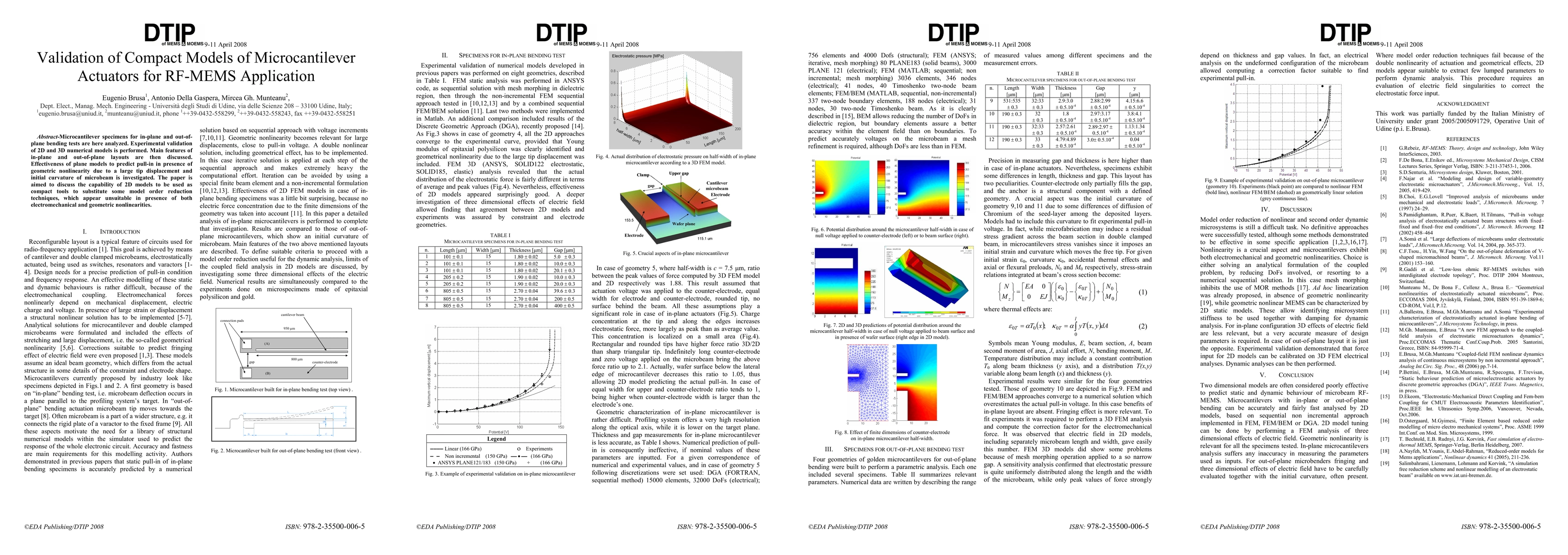Microcantilever specimens for in-plane and out-ofplane bending tests are here analyzed. Experimental validation of 2D and 3D numerical models is performed. Main features of in-plane and out-of-plane layouts are then discussed. Effectiveness of plane models to predict pull-in in presence of geometric nonlinearity due to a large tip displacement and initial curvature of microbeam is investigated. The paper is aimed to discuss the capability of 2D models to be used as compact tools to substitute some model order reduction techniques, which appear unsuitable in presence of both electromechanical and geometric nonlinearities.