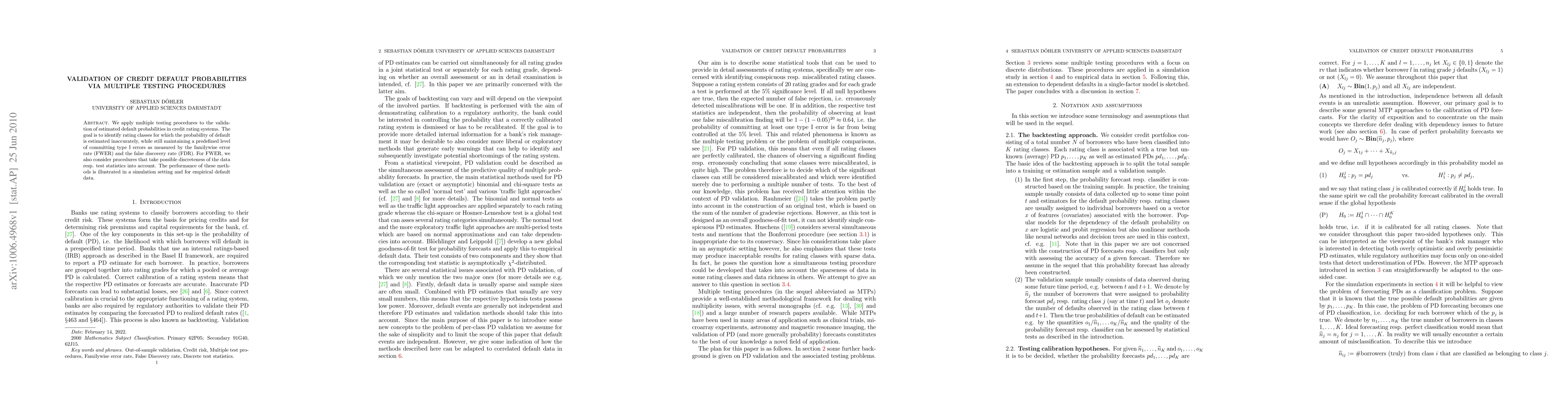 This paper validates estimated credit default probabilities using multiple testing procedures, aiming to pinpoint inaccurately estimated rating classes while controlling type I error rates via the familywise error rate (FWER) and false discovery rate (FDR). The methods' effectiveness is demonstrated through simulations and empirical data analysis.