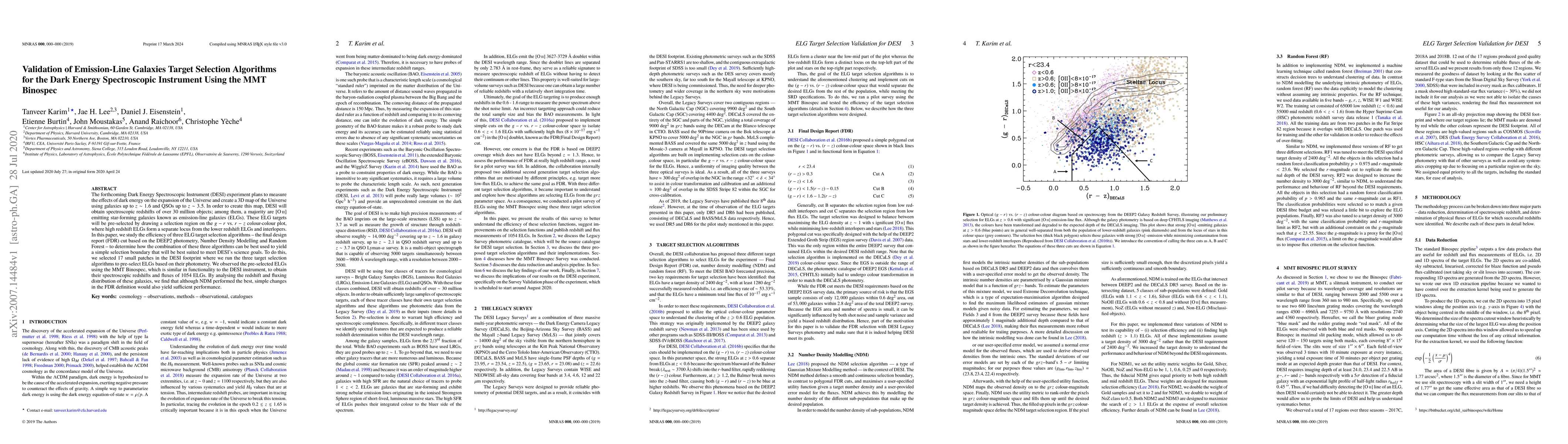 This paper evaluates three algorithms for selecting emission-line galaxies (ELGs) for the Dark Energy Spectroscopic Instrument (DESI) using MMT Binospec observations. The study finds that while Number Density Modelling (NDM) performed the best, adjustments to the final design report (FDR) algorithm could also meet DESI's science goals.