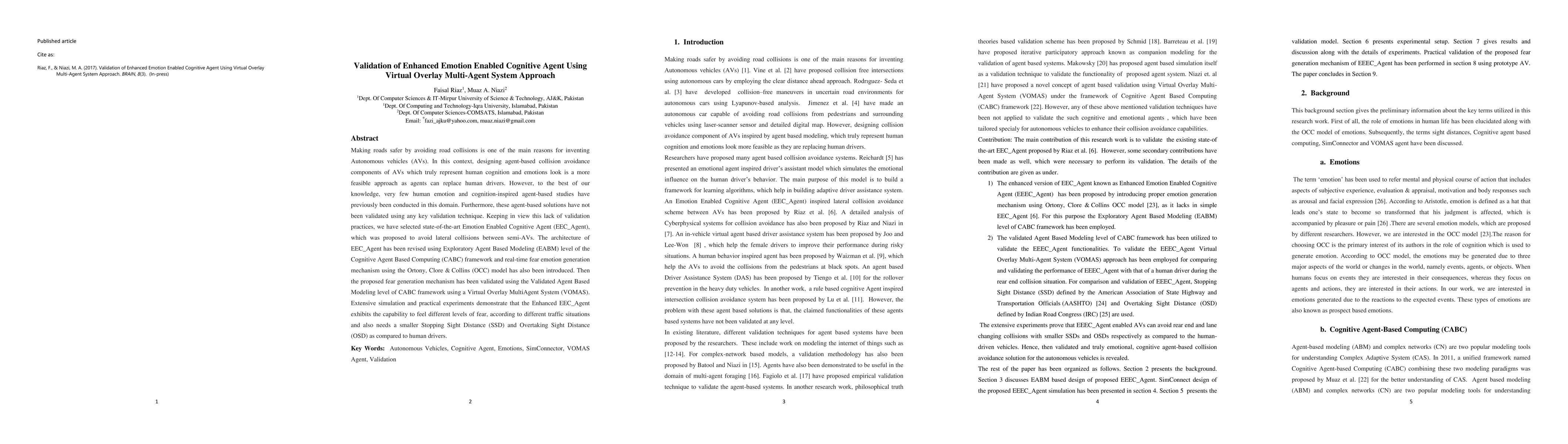 Making roads safer by avoiding road collisions is one of the main reasons for inventing Autonomous vehicles (AVs). In this context, designing agent-based collision avoidance components of AVs which truly represent human cognition and emotions look is a more feasible approach as agents can replace human drivers. However, to the best of our knowledge, very few human emotion and cognition-inspired agent-based studies have previously been conducted in this domain. Furthermore, these agent-based solutions have not been validated using any key validation technique. Keeping in view this lack of validation practices, we have selected state-of-the-art Emotion Enabled Cognitive Agent (EEC_Agent), which was proposed to avoid lateral collisions between semi-AVs. The architecture of EEC_Agent has been revised using Exploratory Agent Based Modeling (EABM) level of the Cognitive Agent Based Computing (CABC) framework and real-time fear emotion generation mechanism using the Ortony, Clore & Collins (OCC) model has also been introduced. Then the proposed fear generation mechanism has been validated using the Validated Agent Based Modeling level of CABC framework using a Virtual Overlay MultiAgent System (VOMAS). Extensive simulation and practical experiments demonstrate that the Enhanced EEC_Agent exhibits the capability to feel different levels of fear, according to different traffic situations and also needs a smaller Stopping Sight Distance (SSD) and Overtaking Sight Distance (OSD) as compared to human drivers.